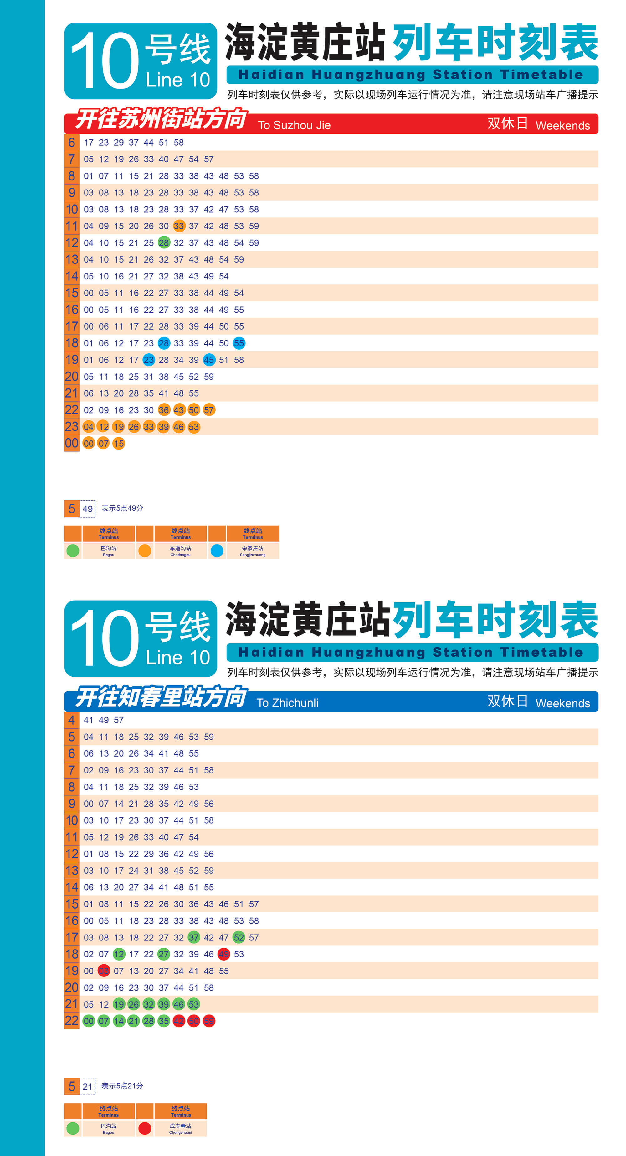 10号线 车道沟—宋家庄—巴沟(外环)首车 6:17末车(全程) 22:30末车(车道沟) 0:1510号线 巴沟—-宋家庄—车道沟(内环)首车 4:41末车(全程) 20:51末车(巴沟) 22:35末车(成寿寺) 22:59