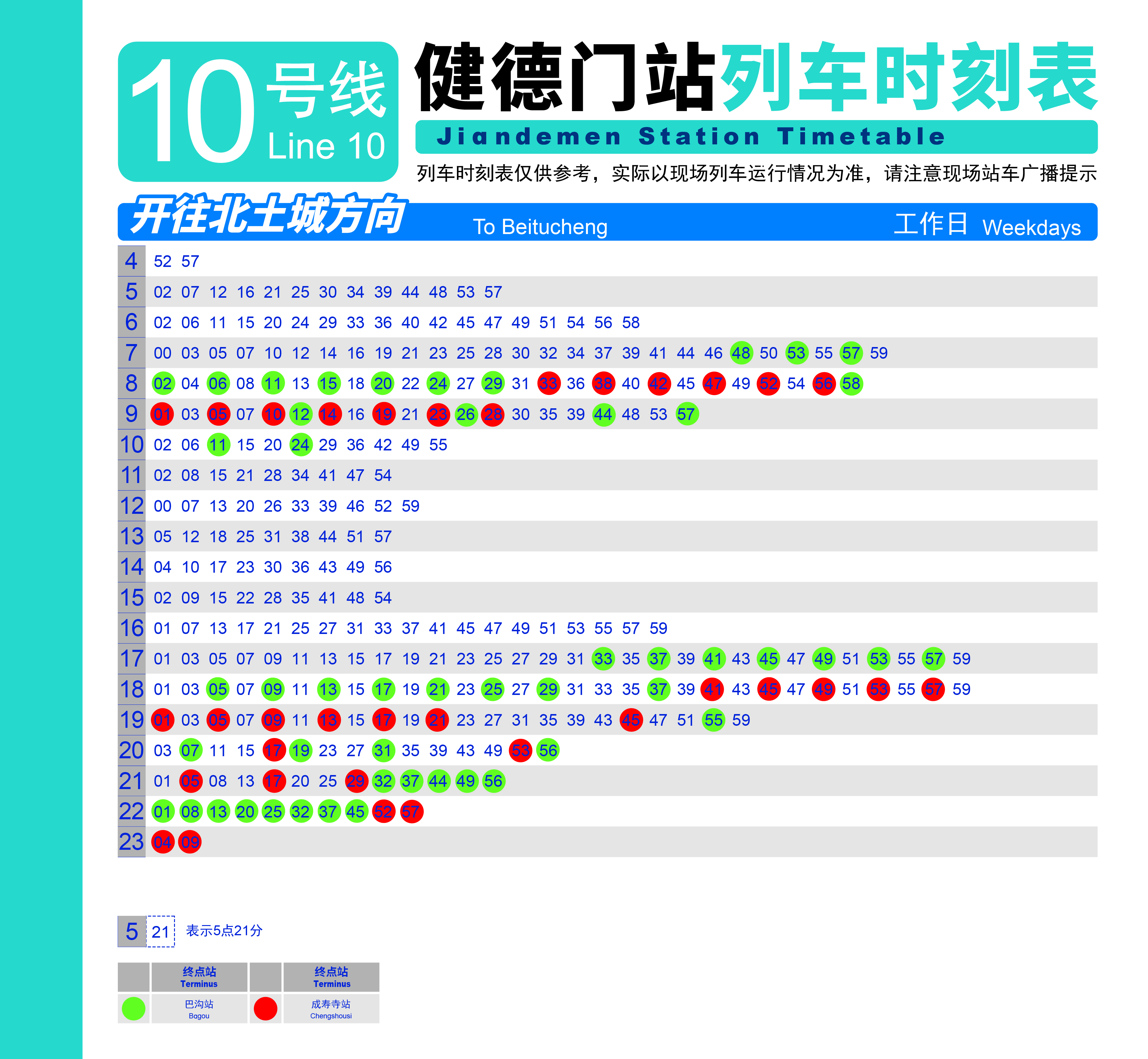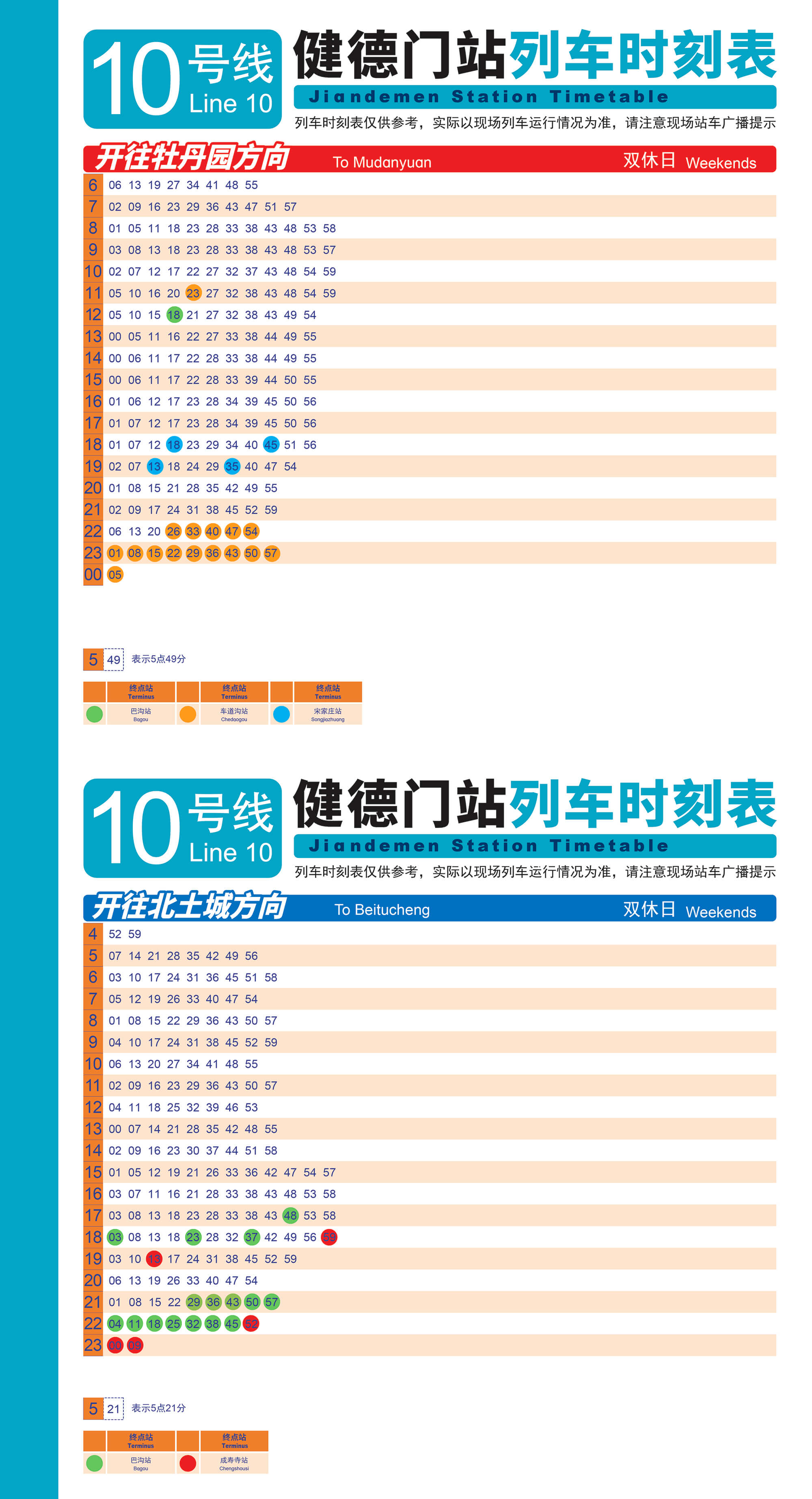 10号线 车道沟—宋家庄—巴沟(外环)首车 6:06末车(全程) 22:20末车(车道沟) 0:0510号线 巴沟—宋家庄—车道沟(内环)首车 4:52末车(全程) 21:01末车(巴沟) 22:45末车(成寿寺) 23:09