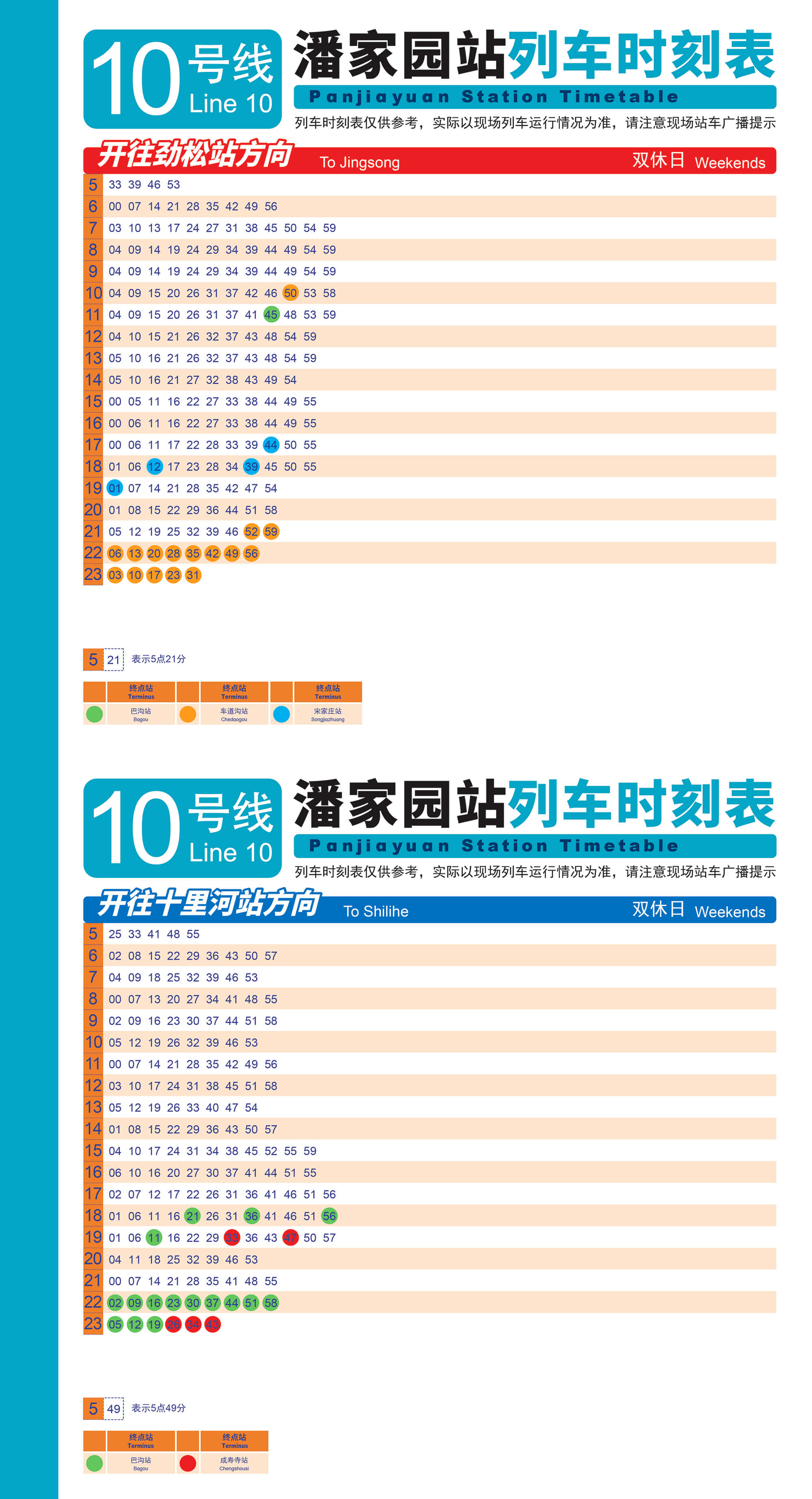 10号线 车道沟—宋家庄—巴沟(外环)首车 5:33末车(全程) 21:46末车(车道沟) 23:3110号线 巴沟—宋家庄—车道沟(内环)首车 5:25末车(全程) 21:35末车(巴沟) 23:19末车(成寿寺) 23:43