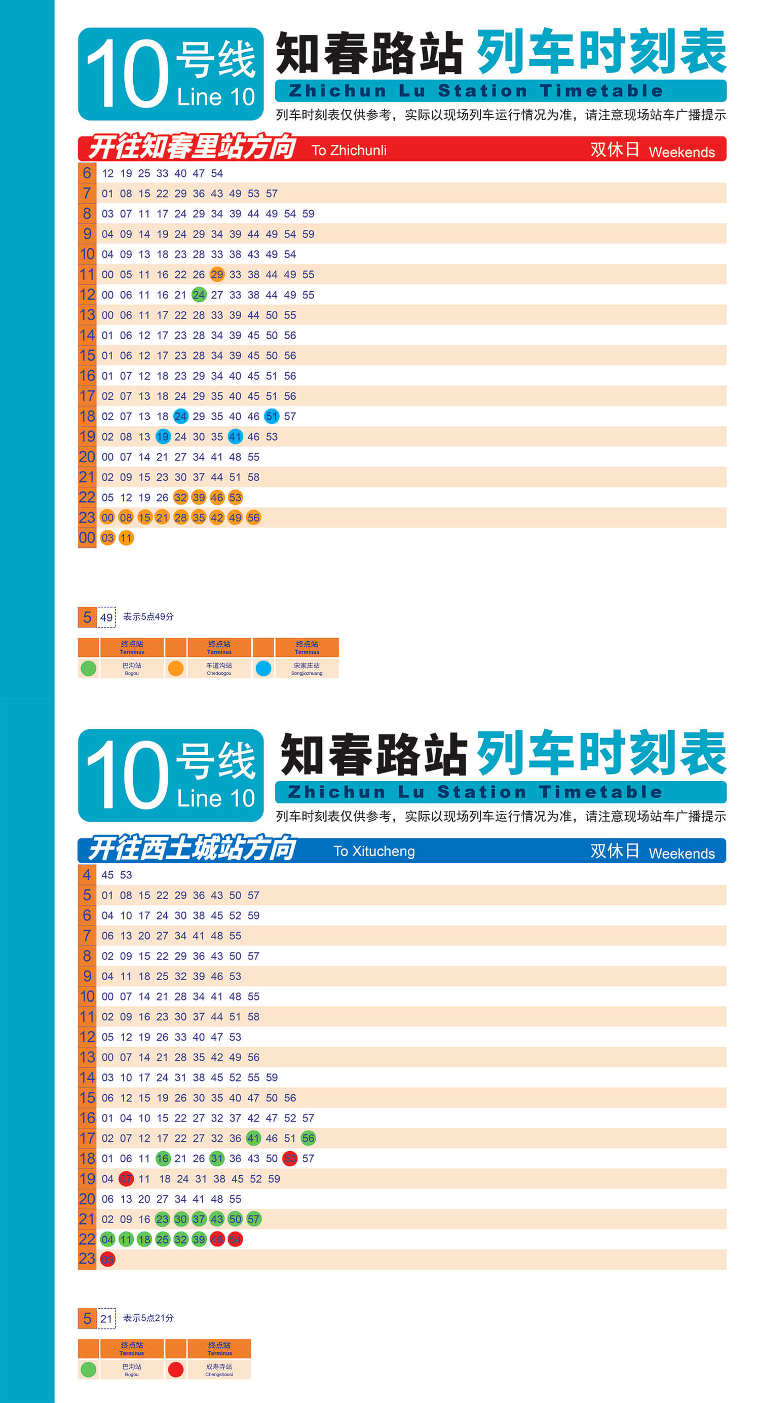 10号线 车道沟—宋家庄—巴沟(外环)首车 6:12末车(全程) 22:26末车(车道沟) 0:1110号线 巴沟—宋家庄—车道沟(内环)首车 4:45末车(全程) 20:55末车(巴沟) 22:39末车(成寿寺) 23:03