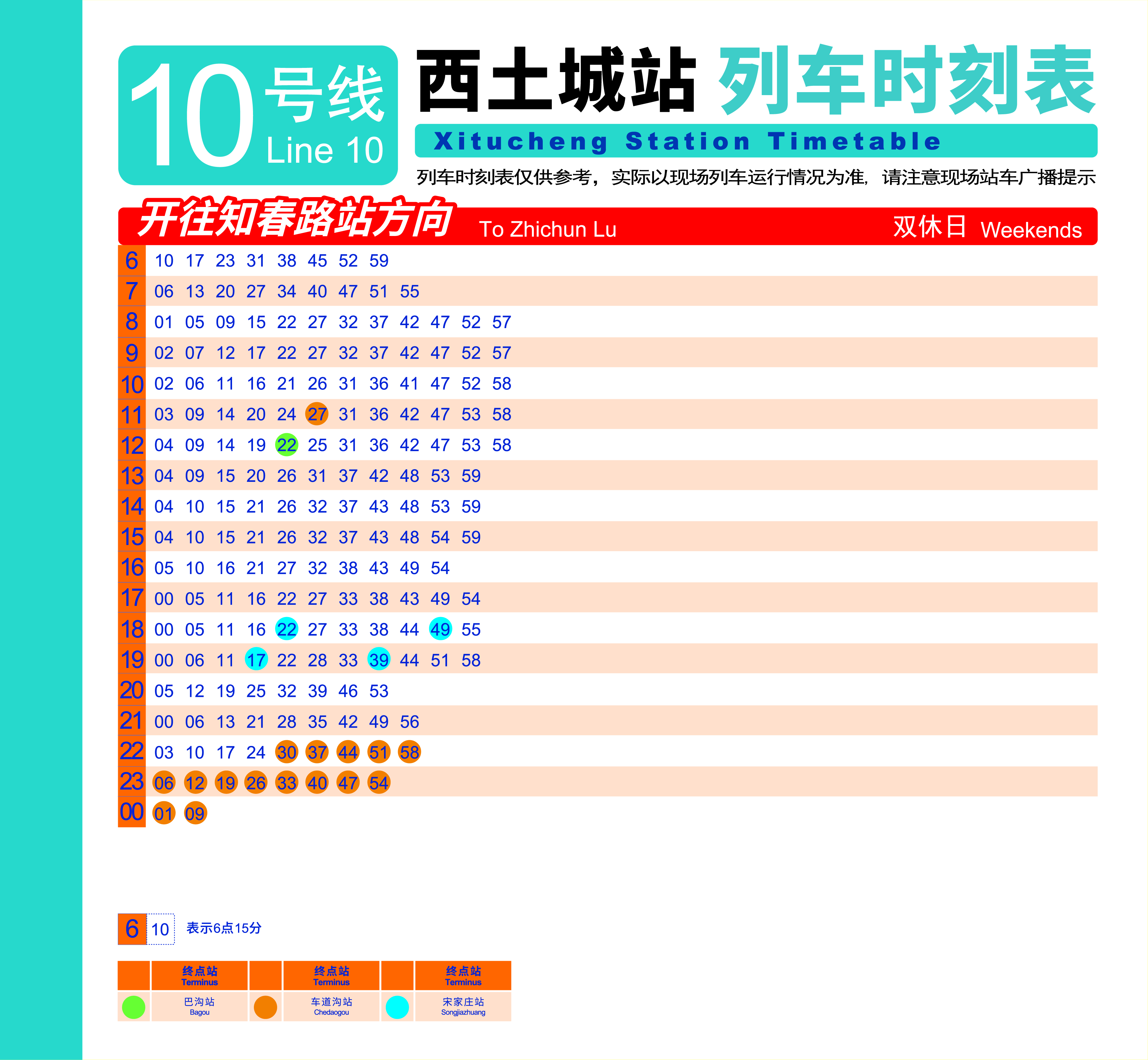 10号线 车道沟—宋家庄—巴沟(外环)首车 6:10末车(全程) 22:24末车(车道沟) 0:0910号线 巴沟—宋家庄—车道沟(内环)首车 4:47末车(全程) 20:57末车(巴沟) 22:41末车(成寿寺) 23:05