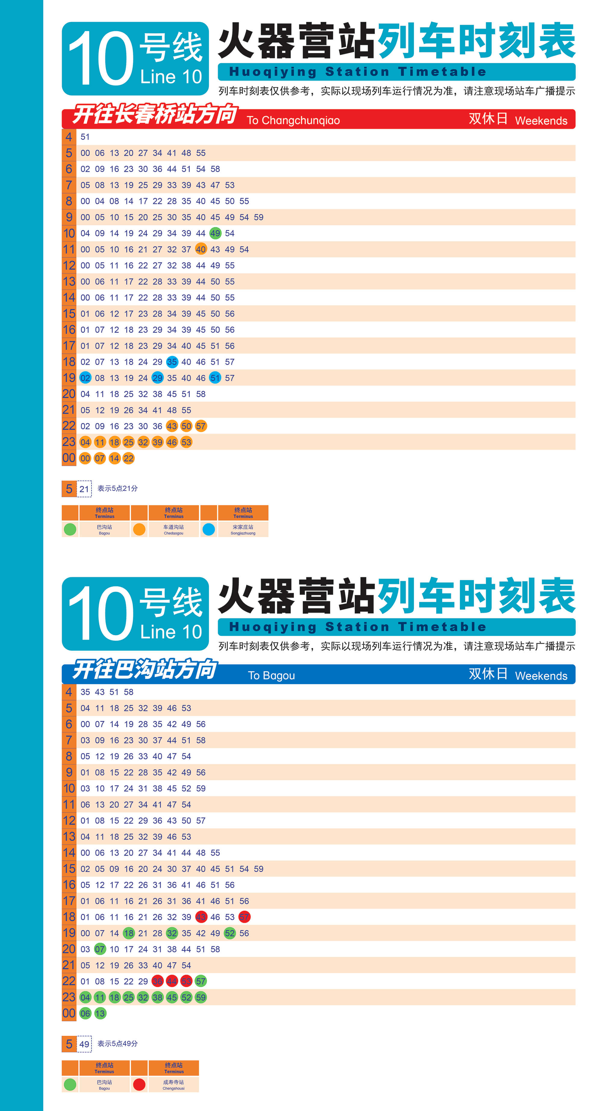 10号线 车道沟—宋家庄—巴沟(外环)首车 4:51末车(全程) 22:36末车(车道沟) 0:2210号线 巴沟—宋家庄—车道沟(内环)首车 4:35末车(全程) 22:29末车(巴沟) 0:13末车(成寿寺) 22:53