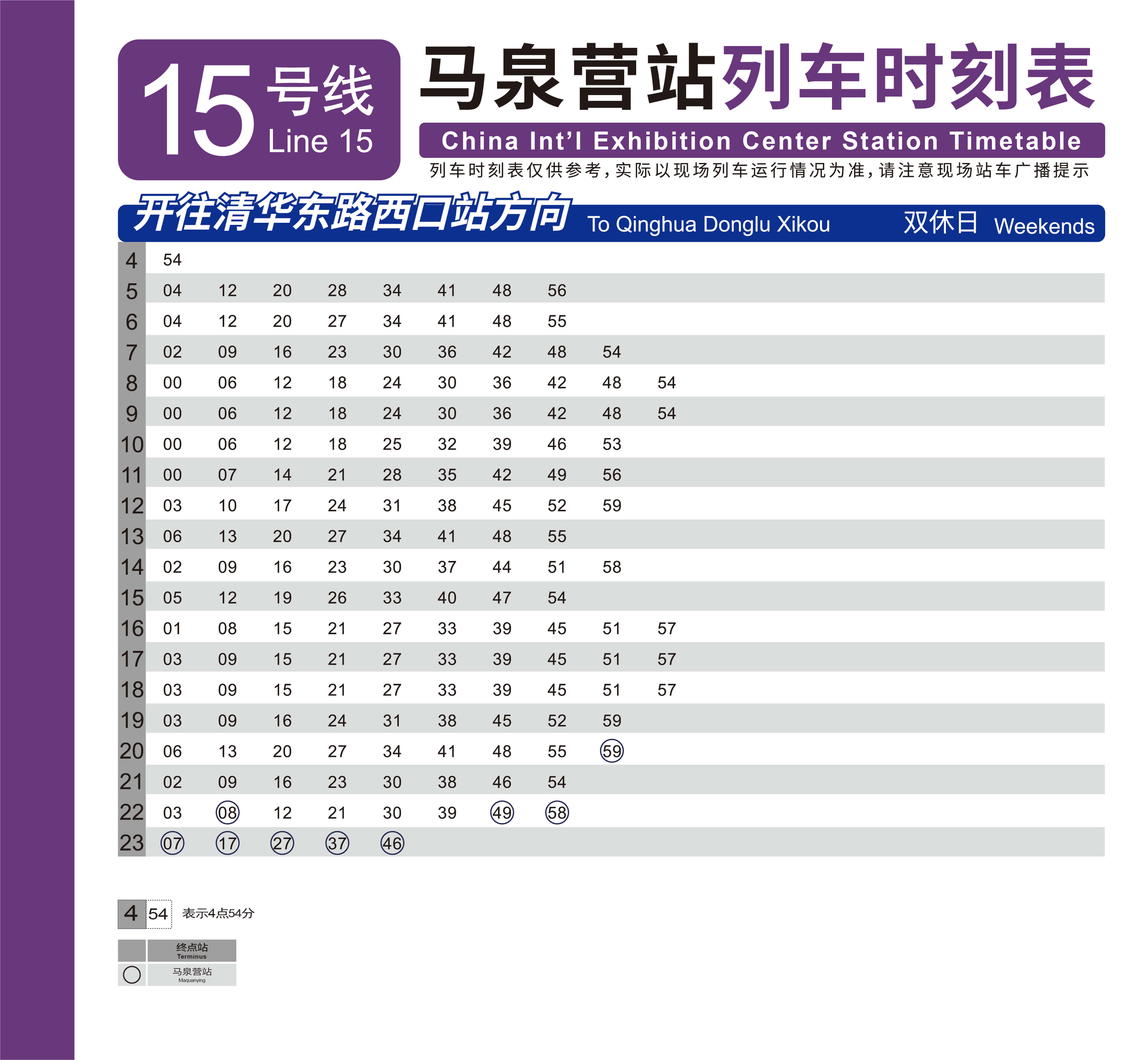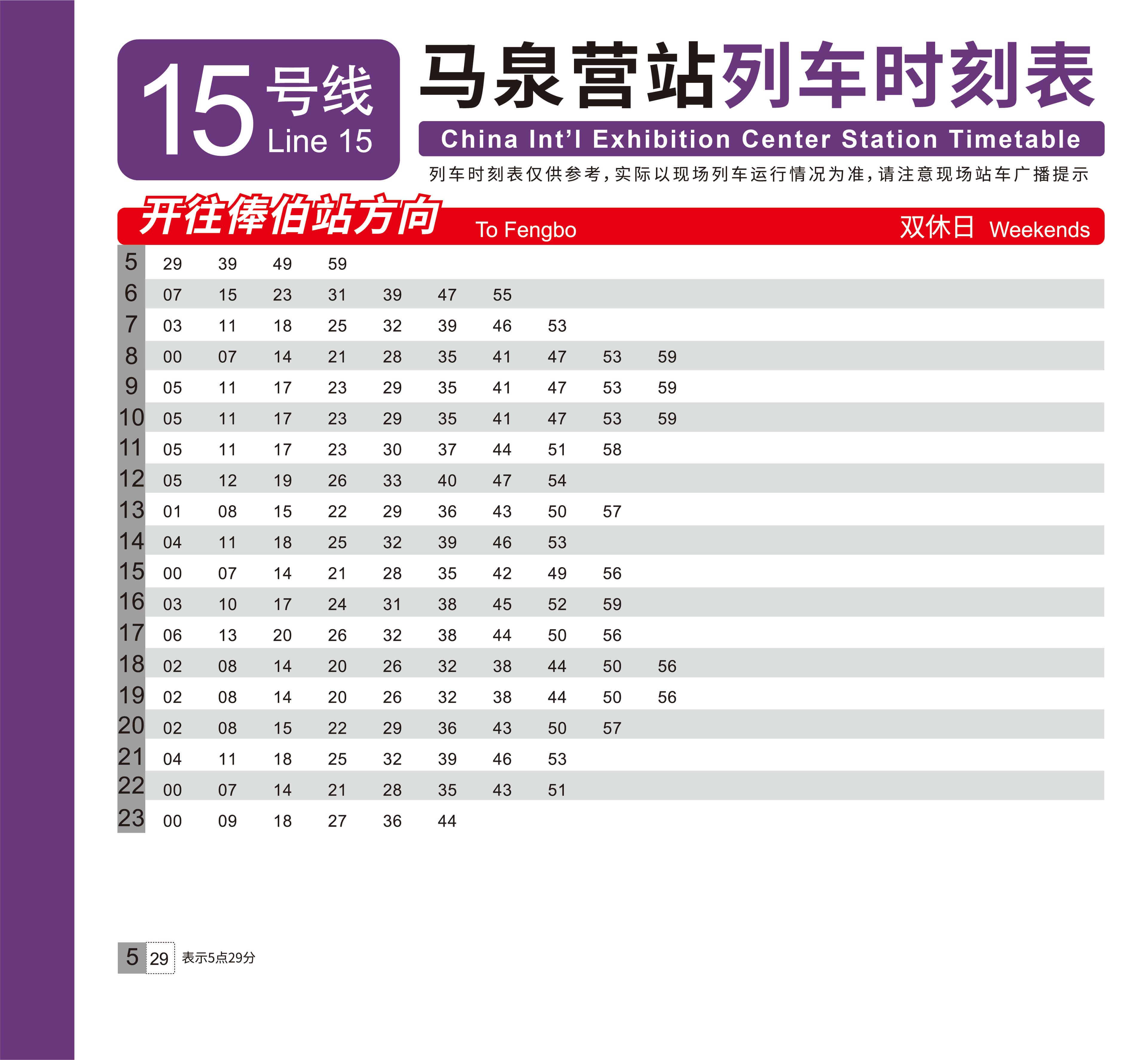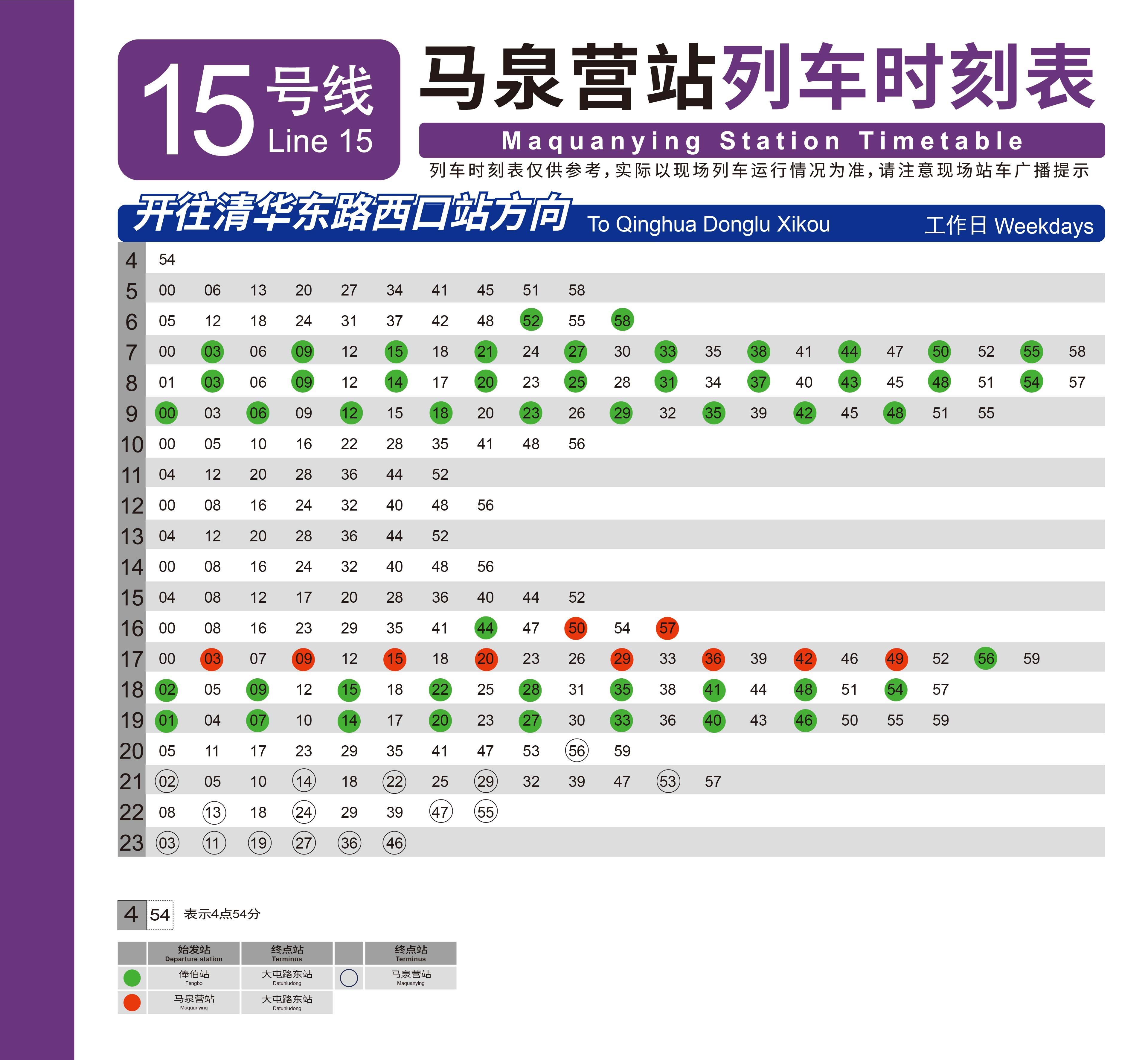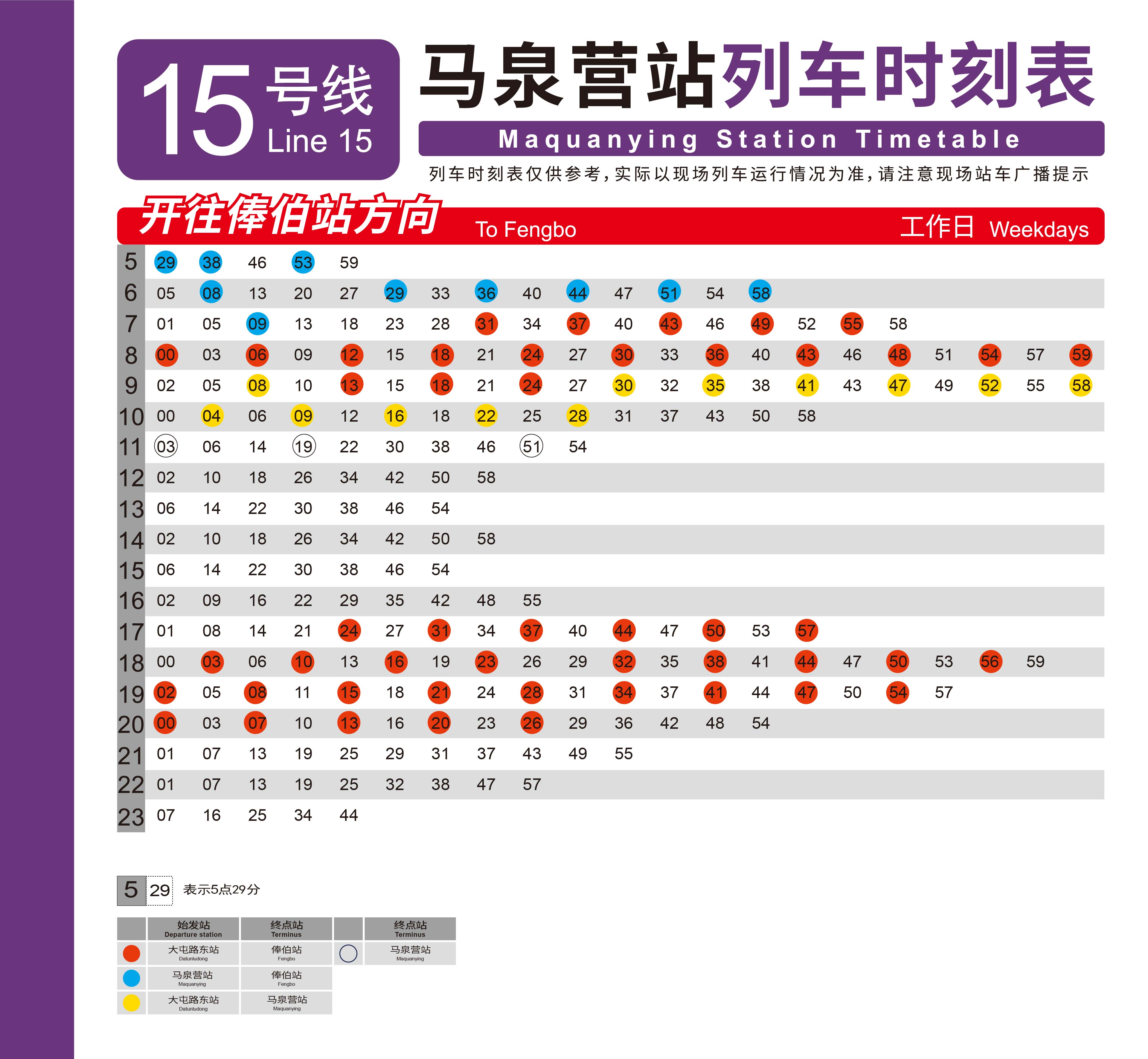 15号线 清华东路西口—俸伯首车 5:29末车 23:4415号线 俸伯—清华东路西口首车 4:54末车 22:39末车(马泉营) ——