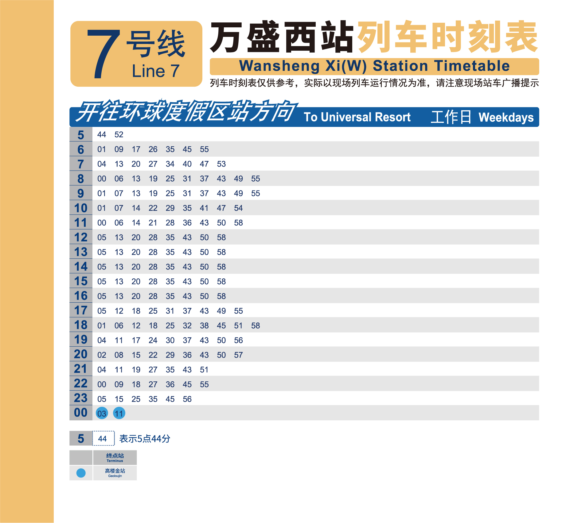 7号线 北京西站—环球度假区首车 5:44末车 23:56末车终点高楼金 0:117号线 环球度假区—北京西站首车 5:21末车 23:11