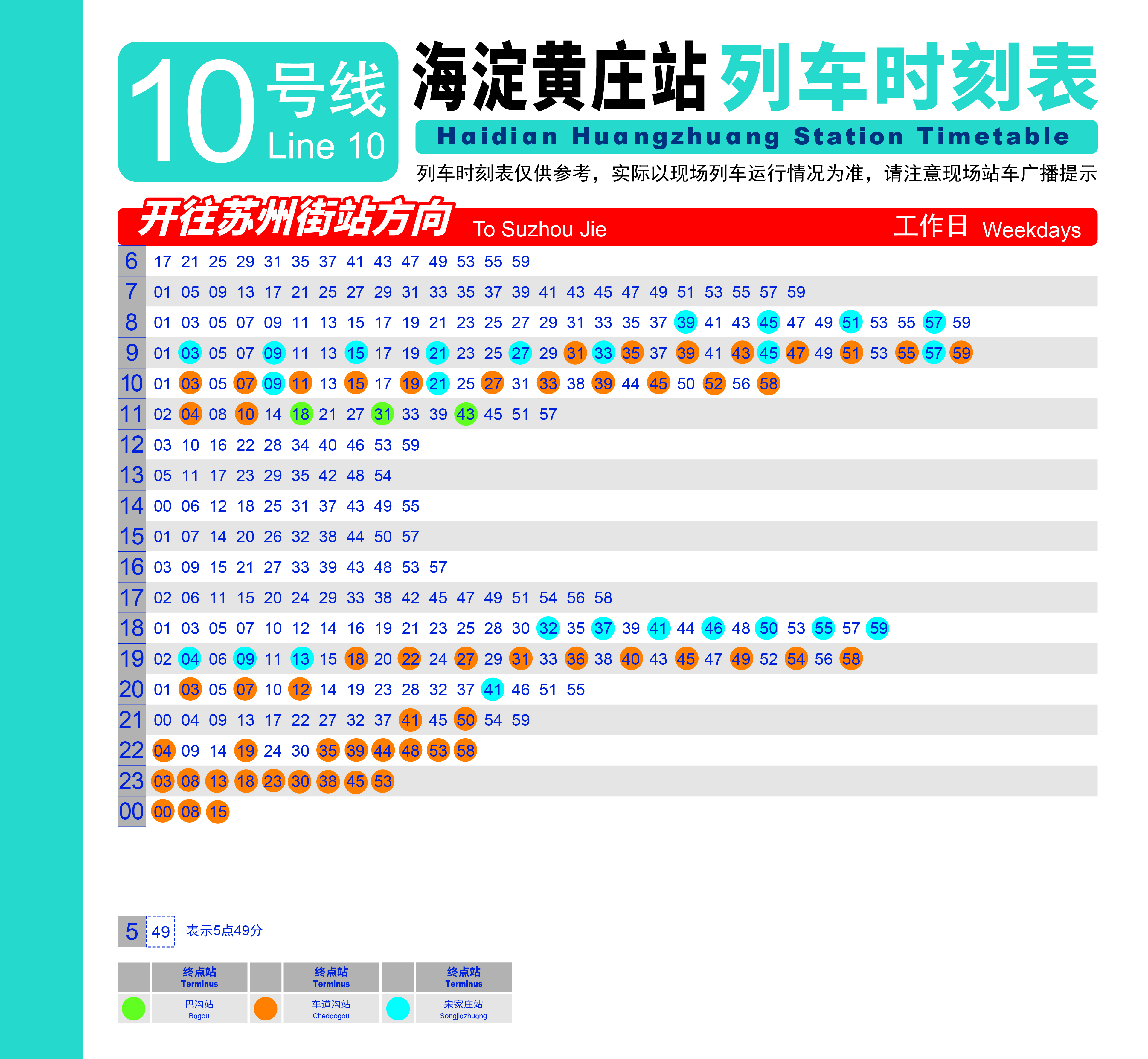 10号线 车道沟—宋家庄—巴沟(外环)首车 6:17末车(全程) 22:30末车(车道沟) 0:1510号线 巴沟—-宋家庄—车道沟(内环)首车 4:41末车(全程) 20:51末车(巴沟) 22:35末车(成寿寺) 22:59
