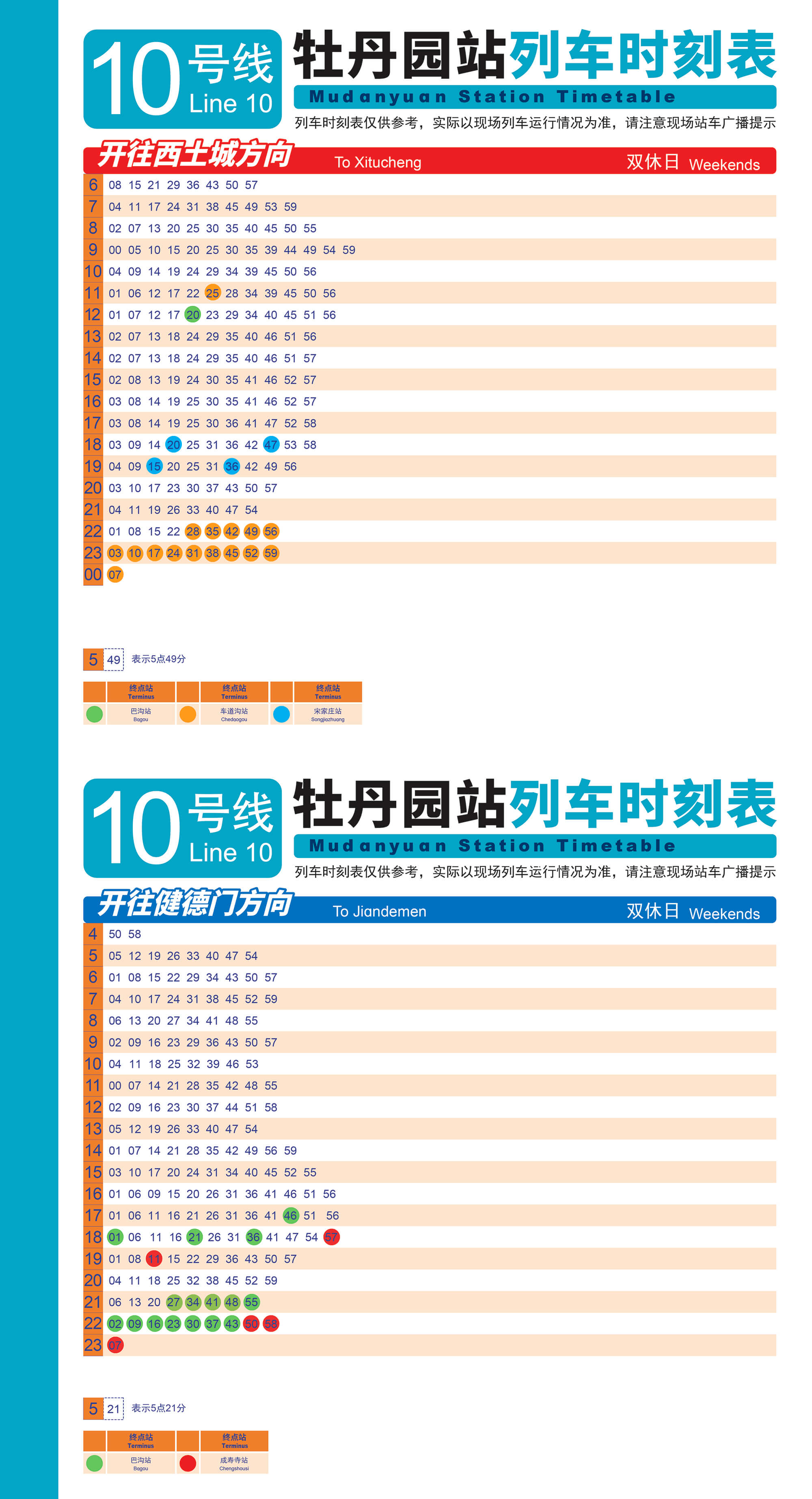 10号线 车道沟—宋家庄—巴沟(外环)首车 6:08末车(全程) 22:22末车(车道沟) 0:0710号线 巴沟—宋家庄—车道沟(内环)首车 4:50末车(全程) 20:59末车(巴沟) 22:43末车(成寿寺) 23:07