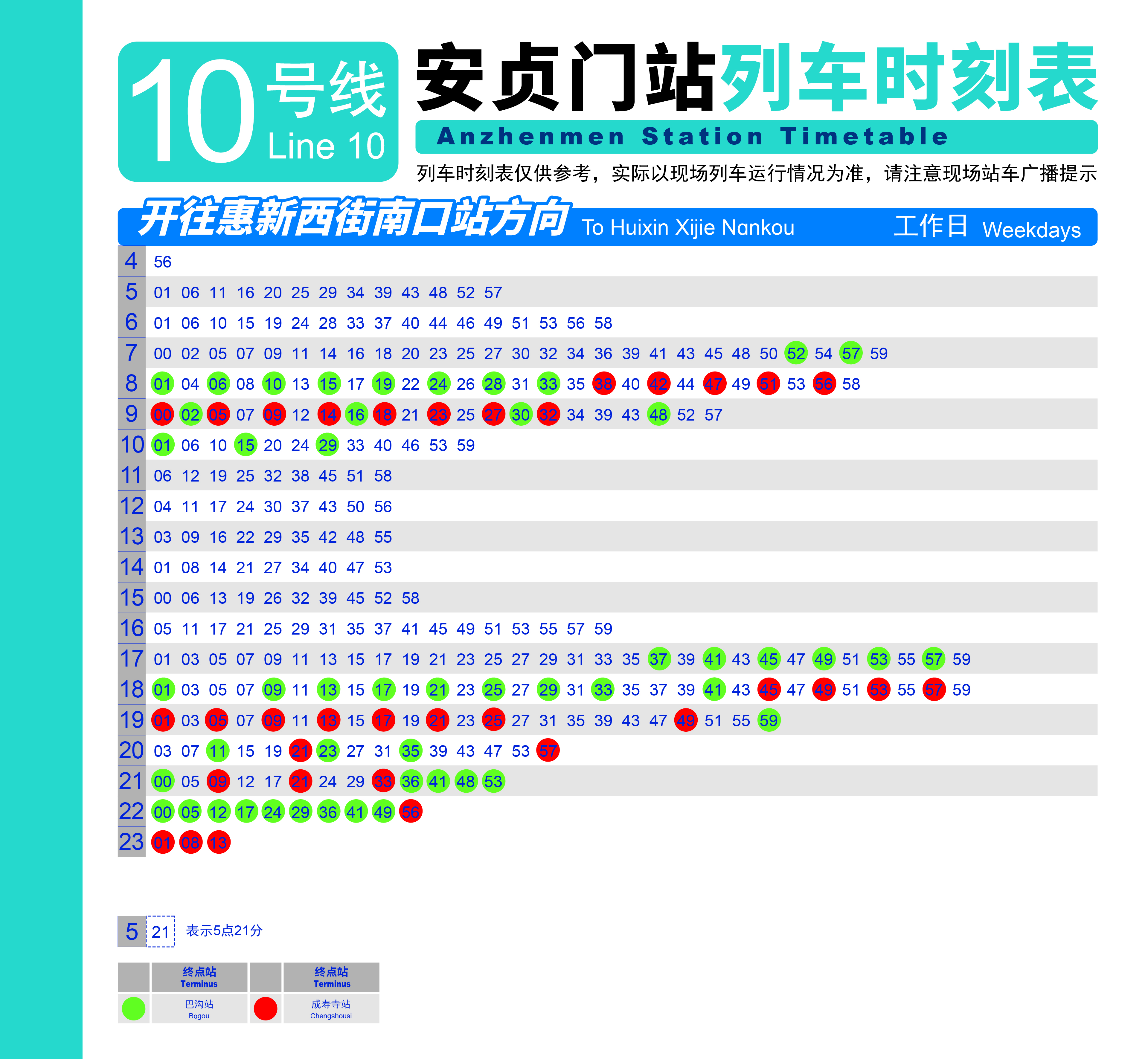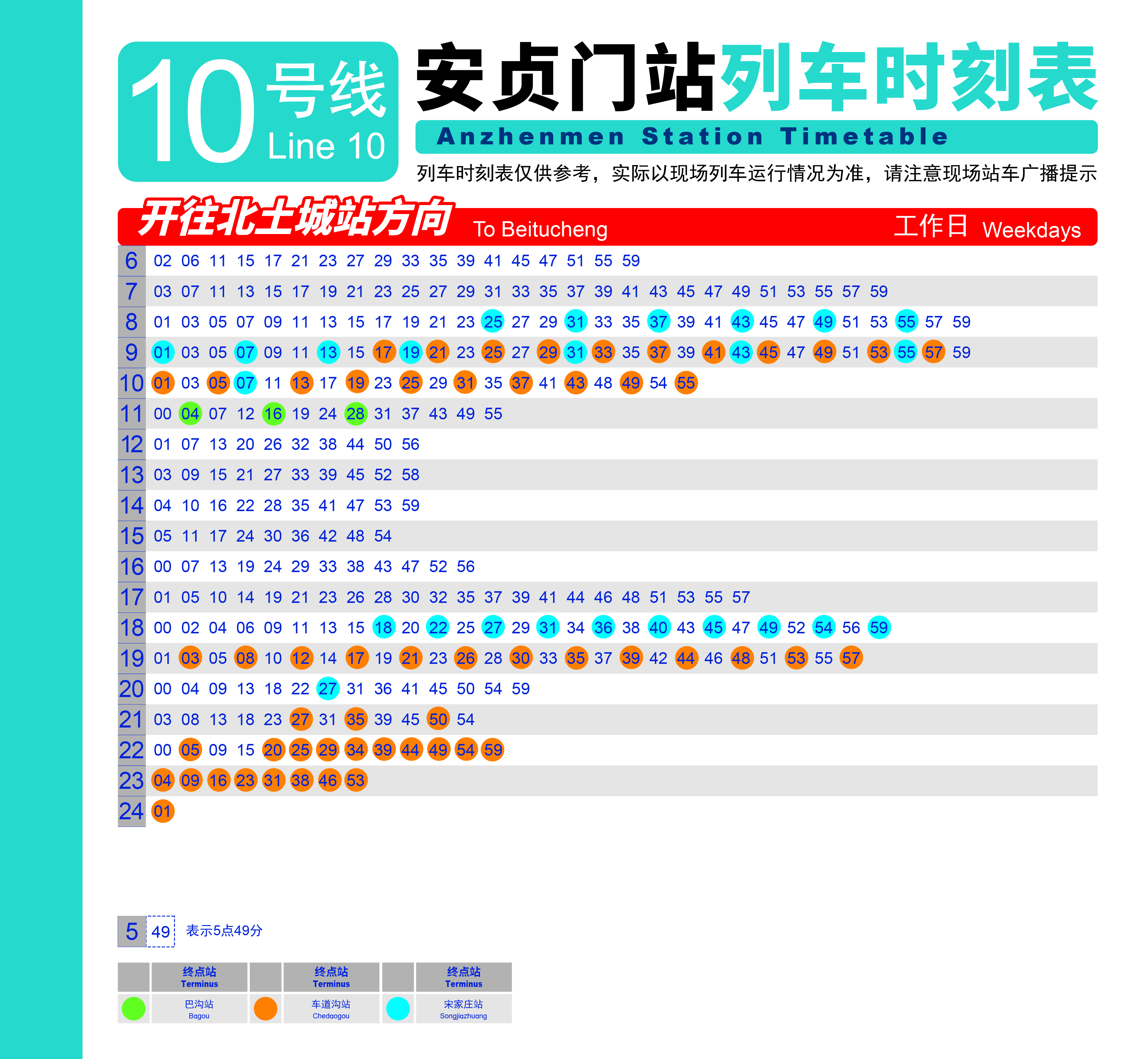 10号线 车道沟—宋家庄—巴沟(外环)首车 6:02末车(全程) 22:15末车(车道沟) 0:0010号线 巴沟—宋家庄—车道沟(内环)首车 4:56末车(全程) 21:06末车(巴沟) 22:50末车(成寿寺) 23:14