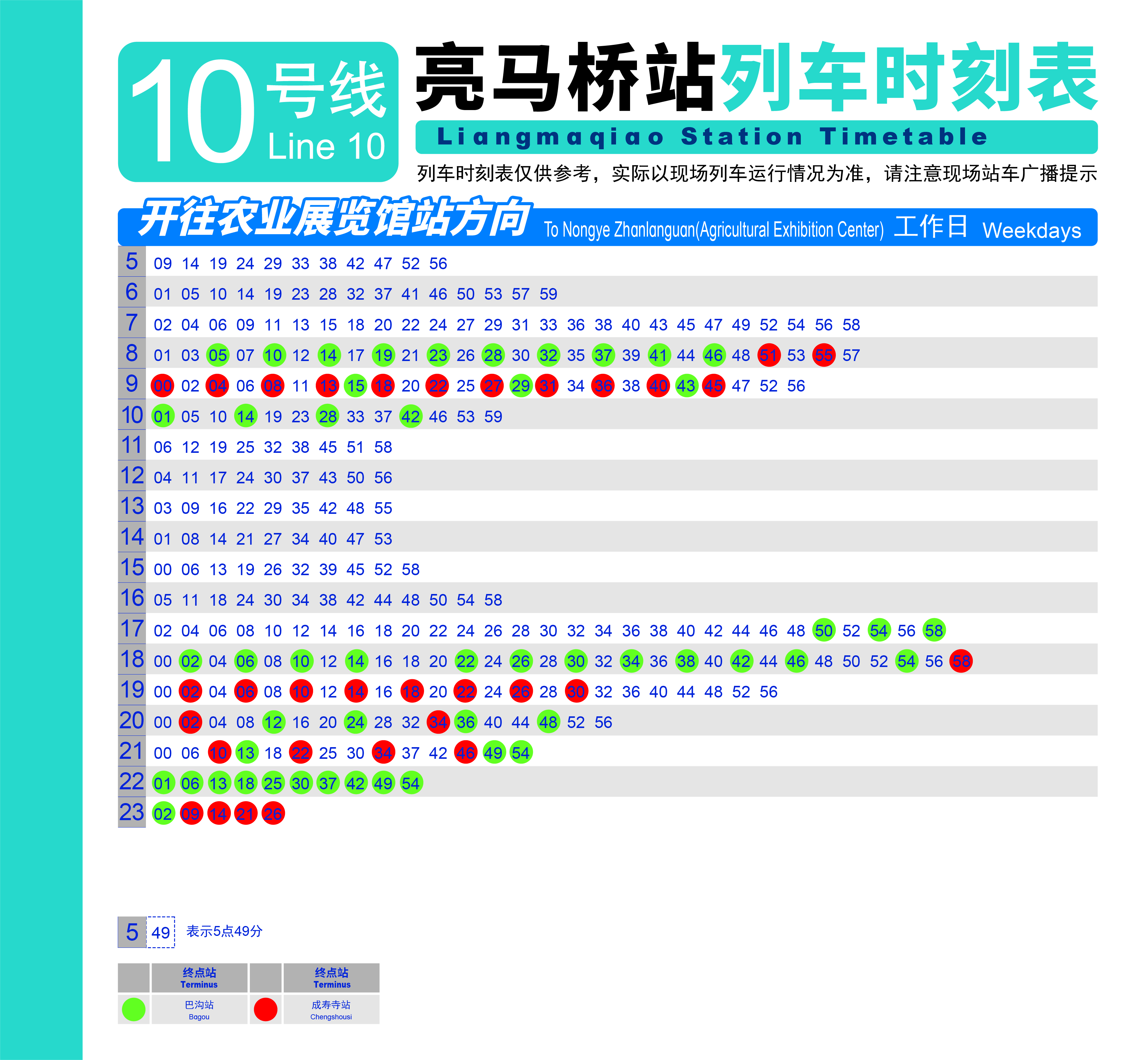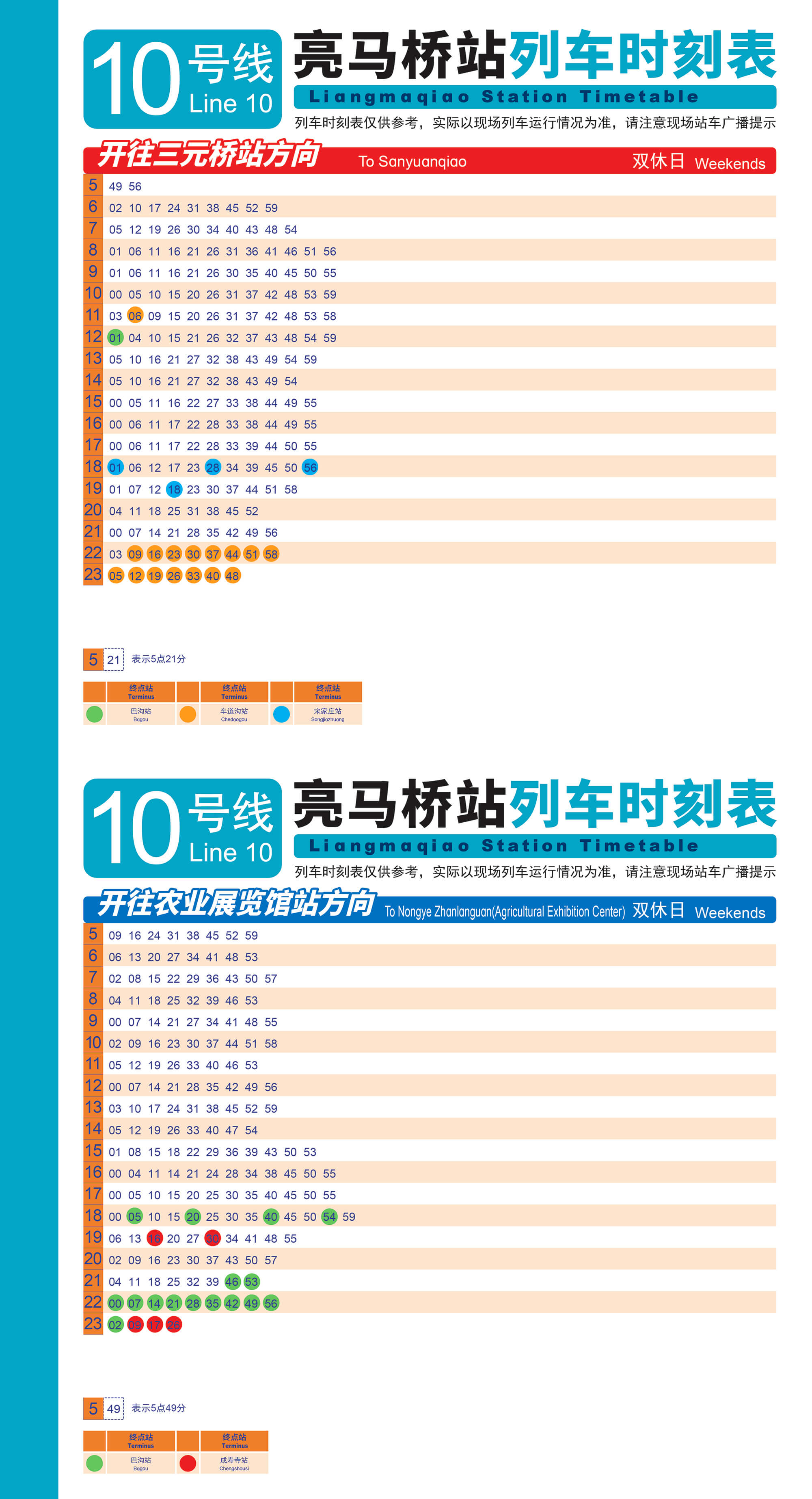 10号线 车道沟—宋家庄—巴沟(外环)首车 5:49末车(全程) 22:03末车(车道沟) 23:4810号线 巴沟—宋家庄—车道沟(内环)首车 5:09末车(全程) 21:18末车(巴沟) 23:02末车(成寿寺) 23:26