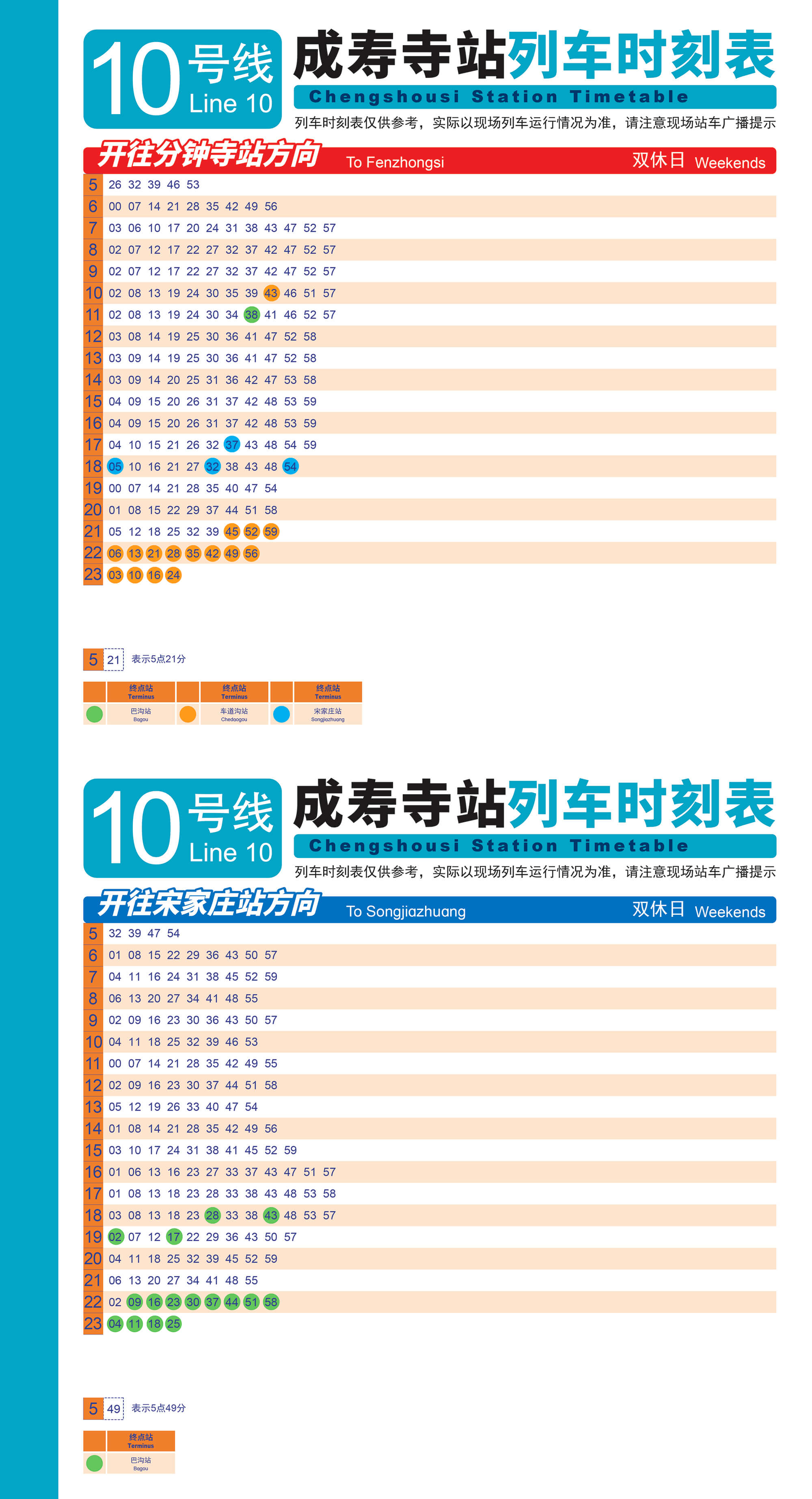 10号线 车道沟—宋家庄—巴沟(外环)首车 5:26末车(全程) 21:39末车(车道沟) 23:2410号线 巴沟—宋家庄—车道沟(内环)首车 5:32末车(全程) 21:41末车(巴沟) 23:25末车(成寿寺) ——