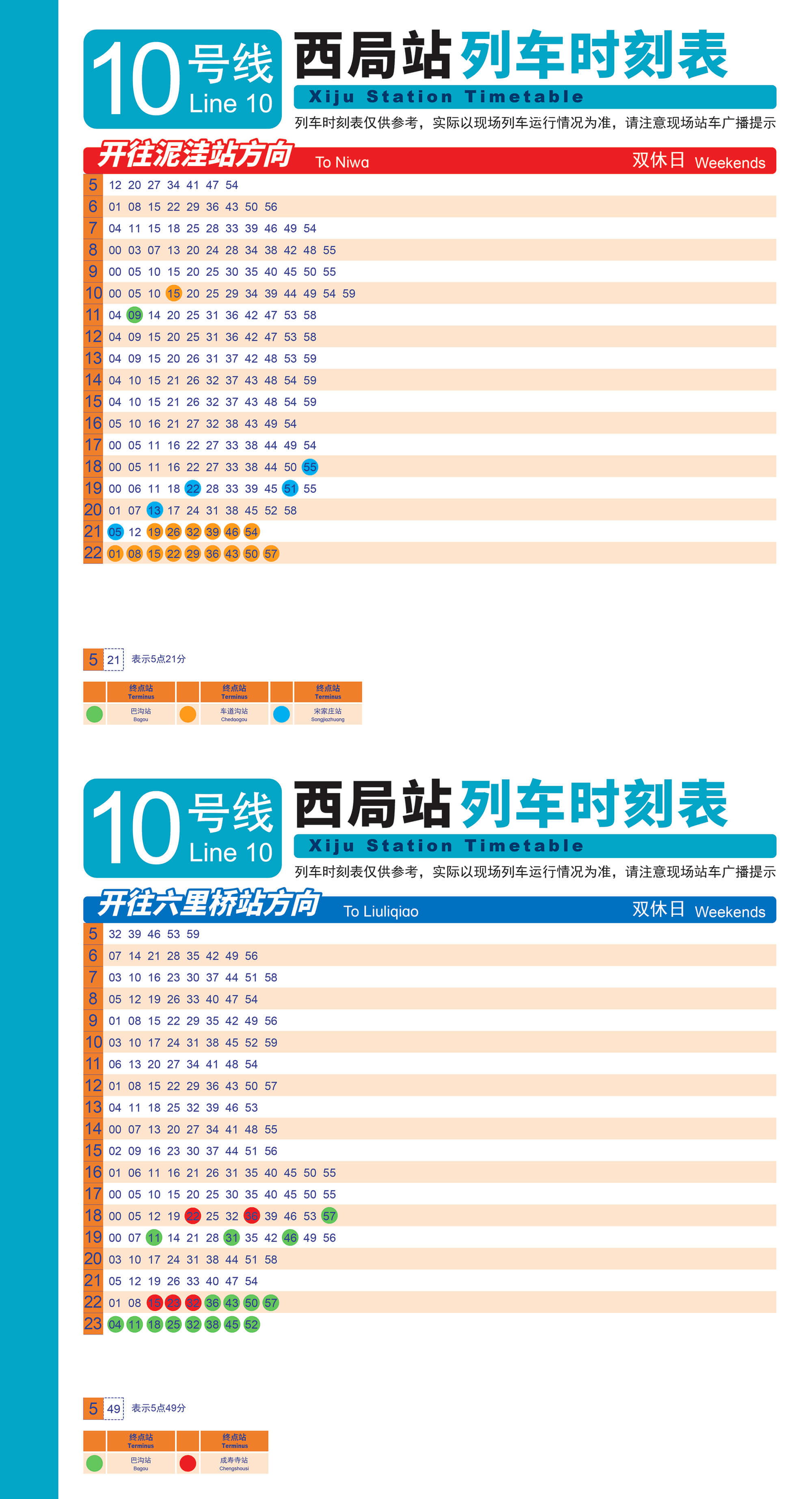 10号线 车道沟—宋家庄—巴沟(外环)首车 5:12末车(全程) 21:12末车(车道沟) 22:5710号线 巴沟—宋家庄—车道沟(内环)首车 5:32末车(全程) 22:08末车(巴沟) 23:52末车(成寿寺) 22:32