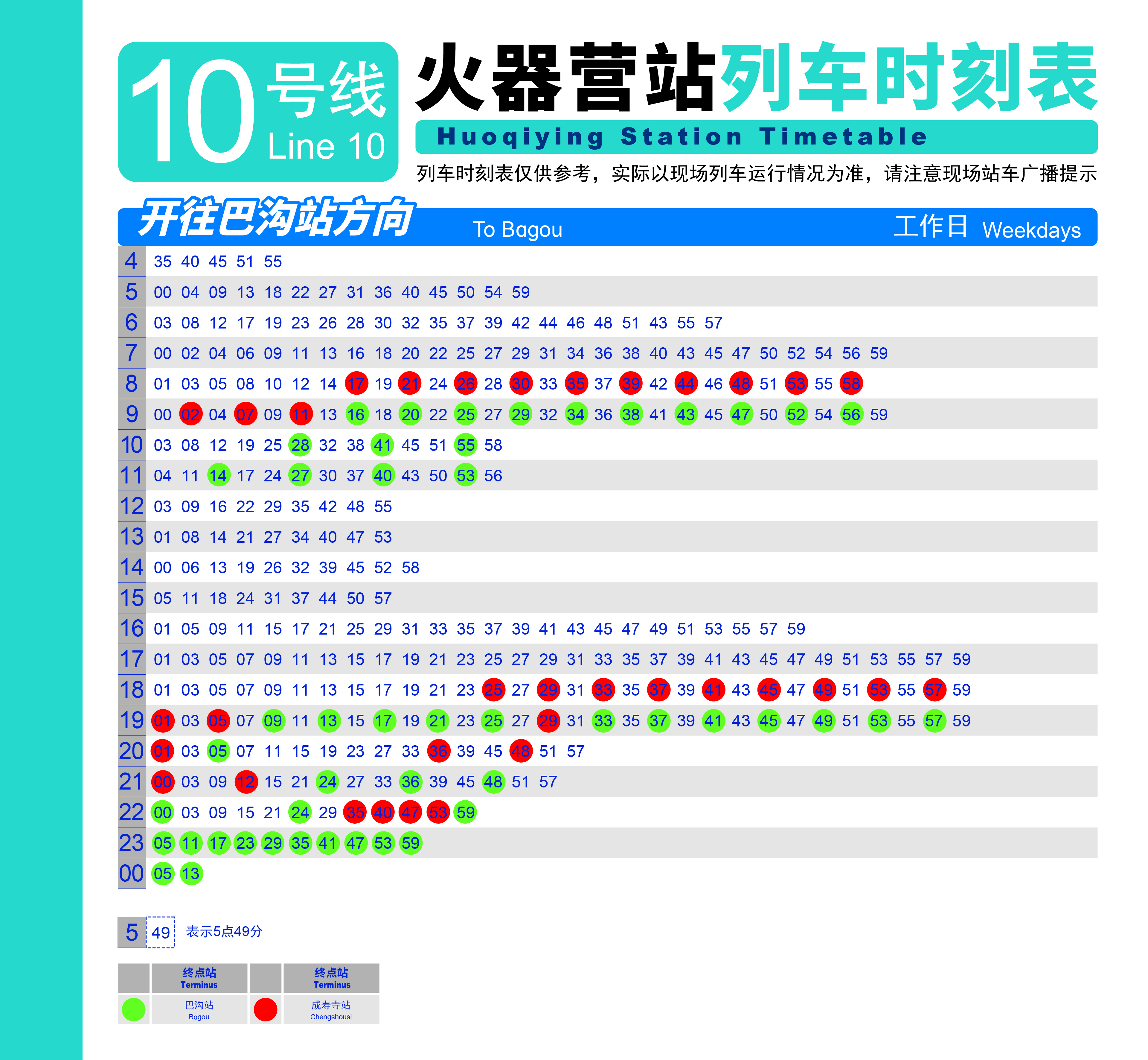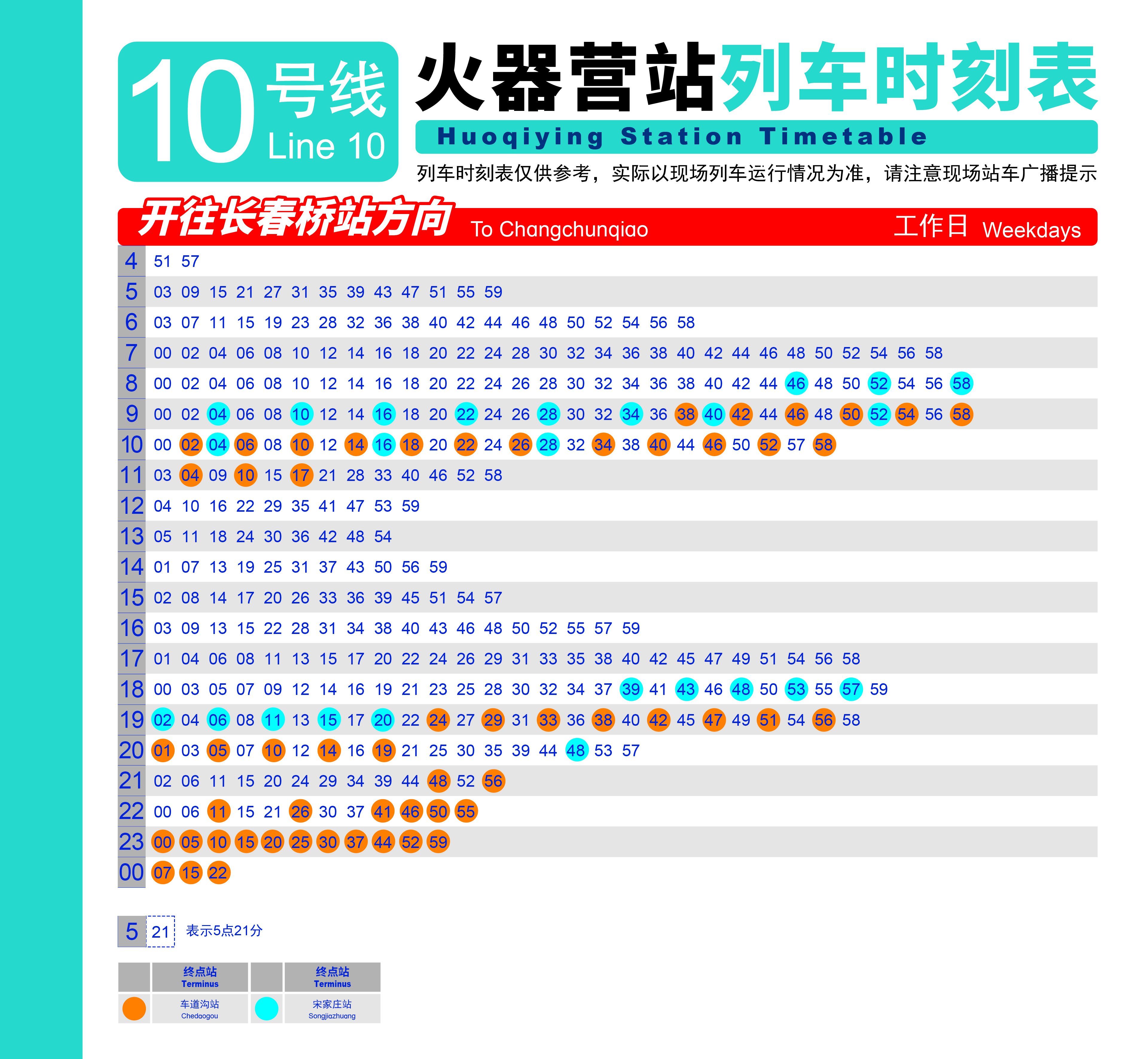 10号线 车道沟—宋家庄—巴沟(外环)首车 4:51末车(全程) 22:36末车(车道沟) 0:2210号线 巴沟—宋家庄—车道沟(内环)首车 4:35末车(全程) 22:29末车(巴沟) 0:13末车(成寿寺) 22:53