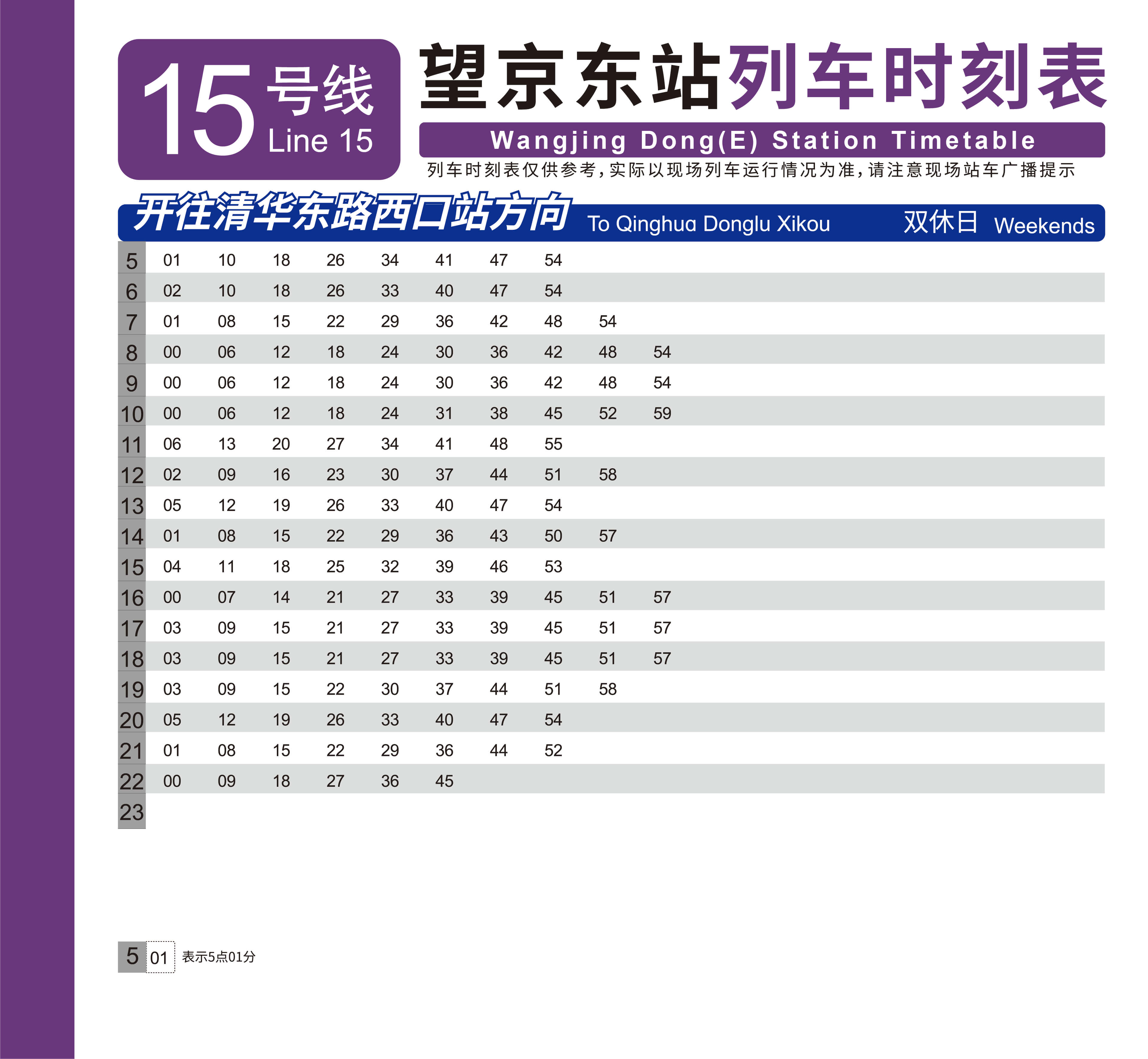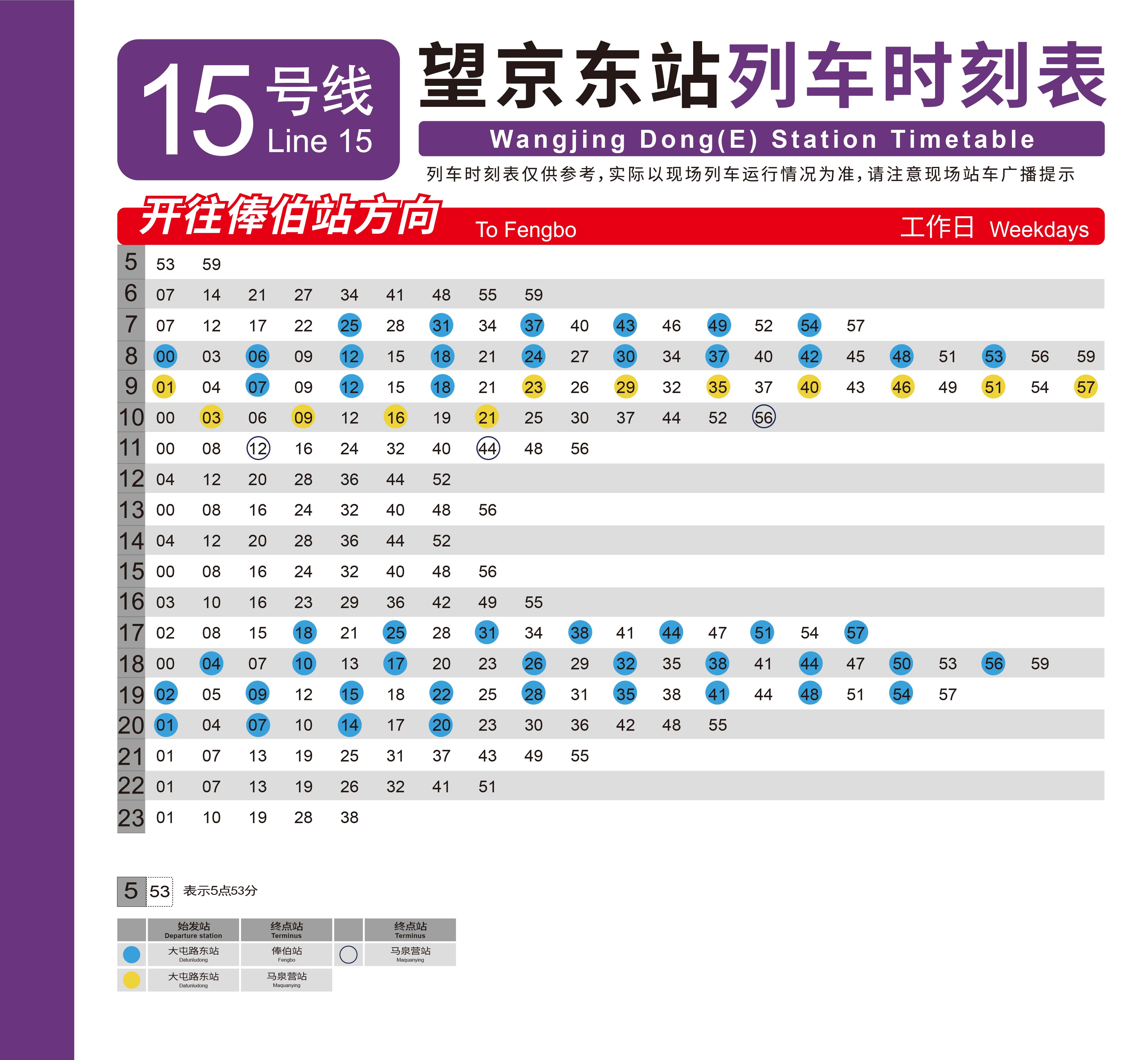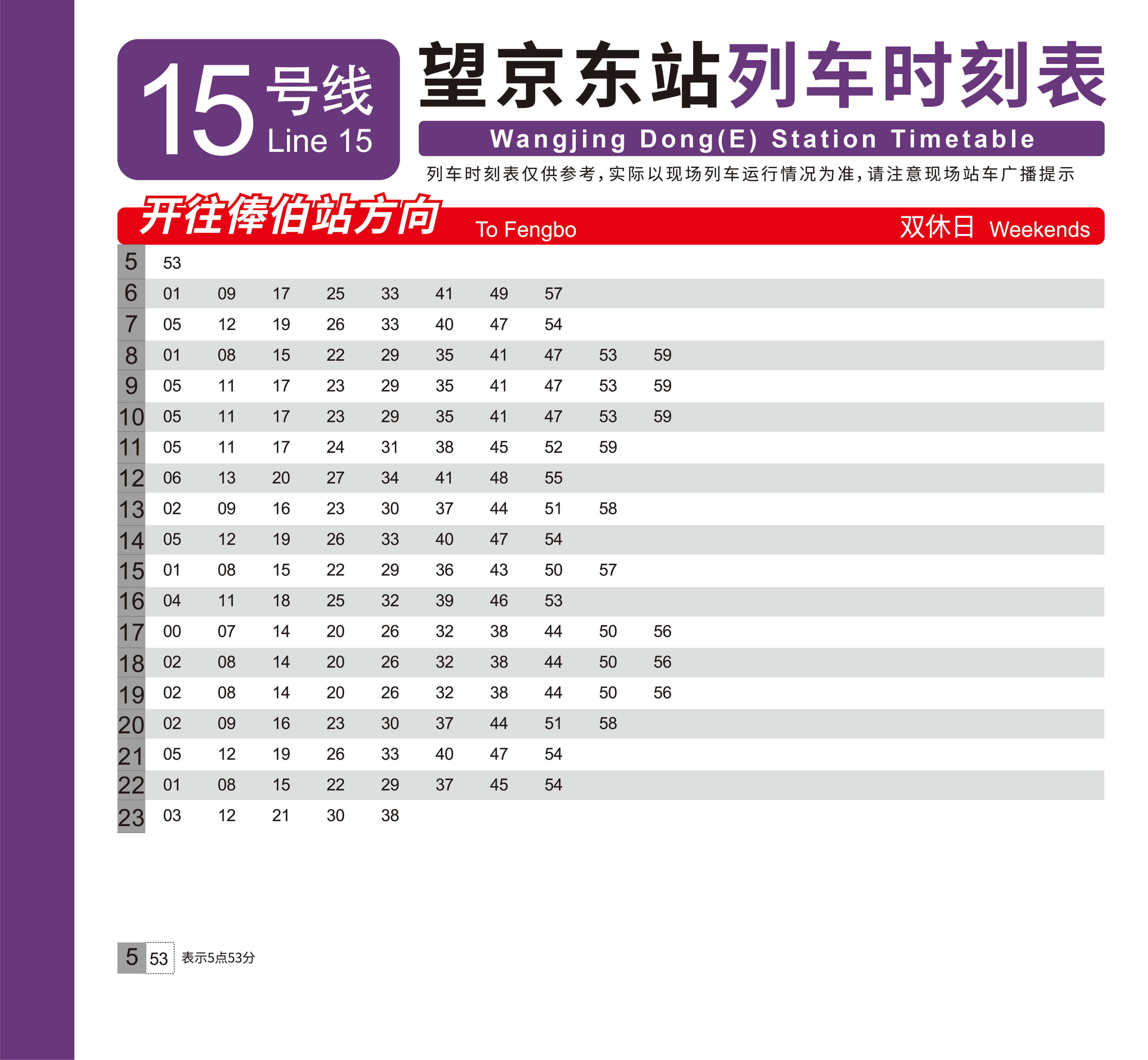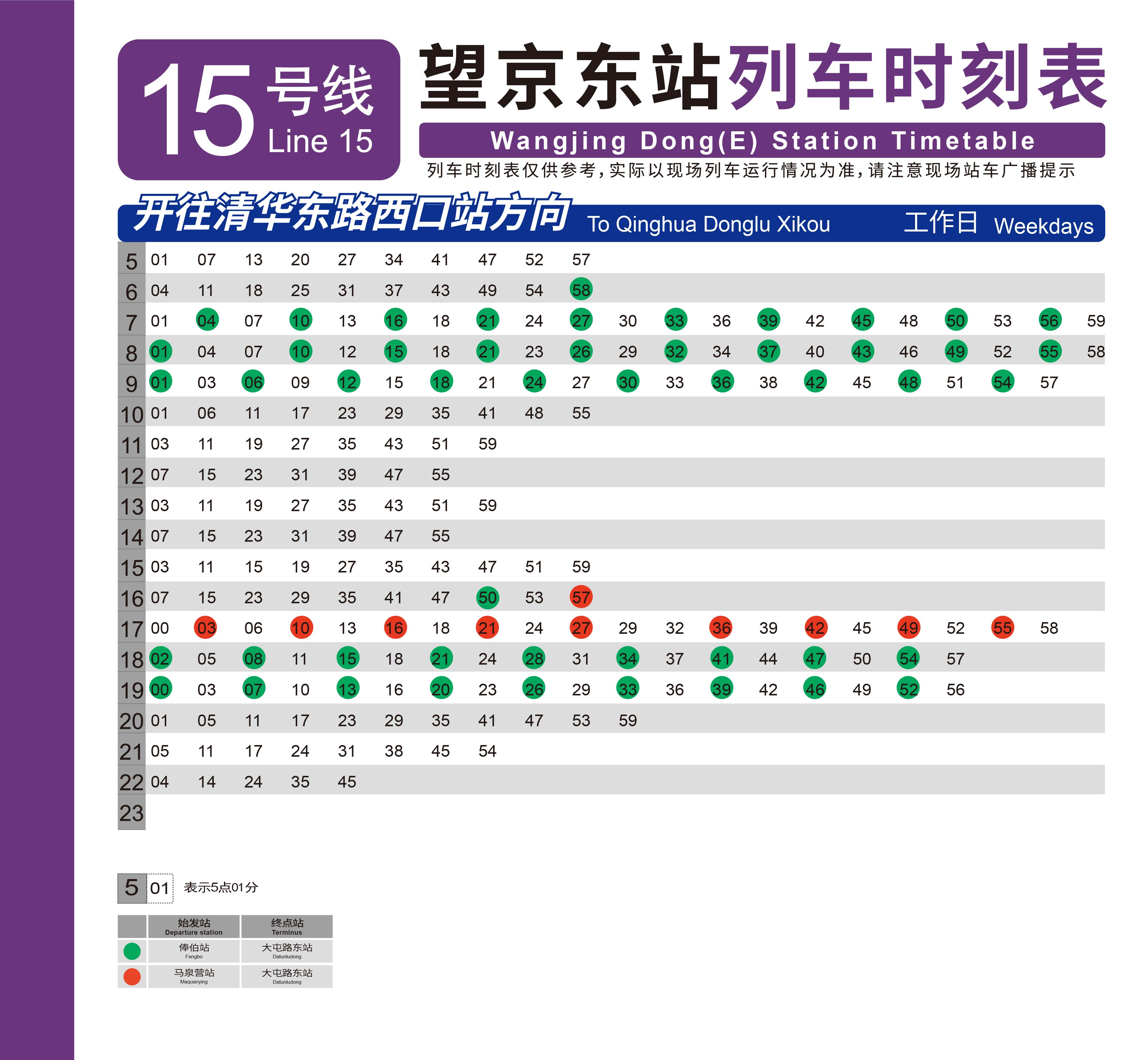 15号线 清华东路西口—俸伯首车 5:53末车 23:3815号线 俸伯—清华东路西口首车 5:01末车 22:45末车(马泉营) ——