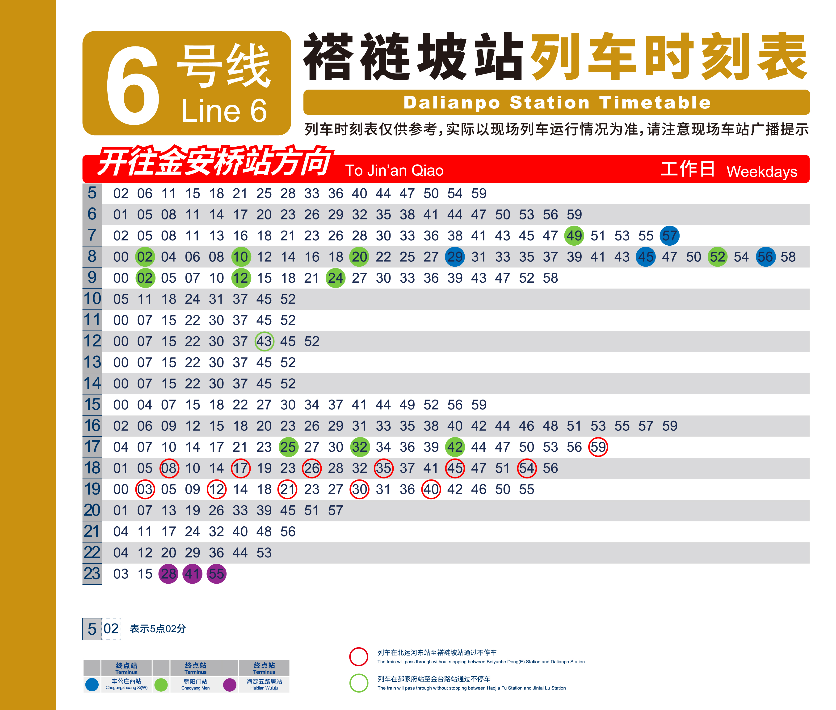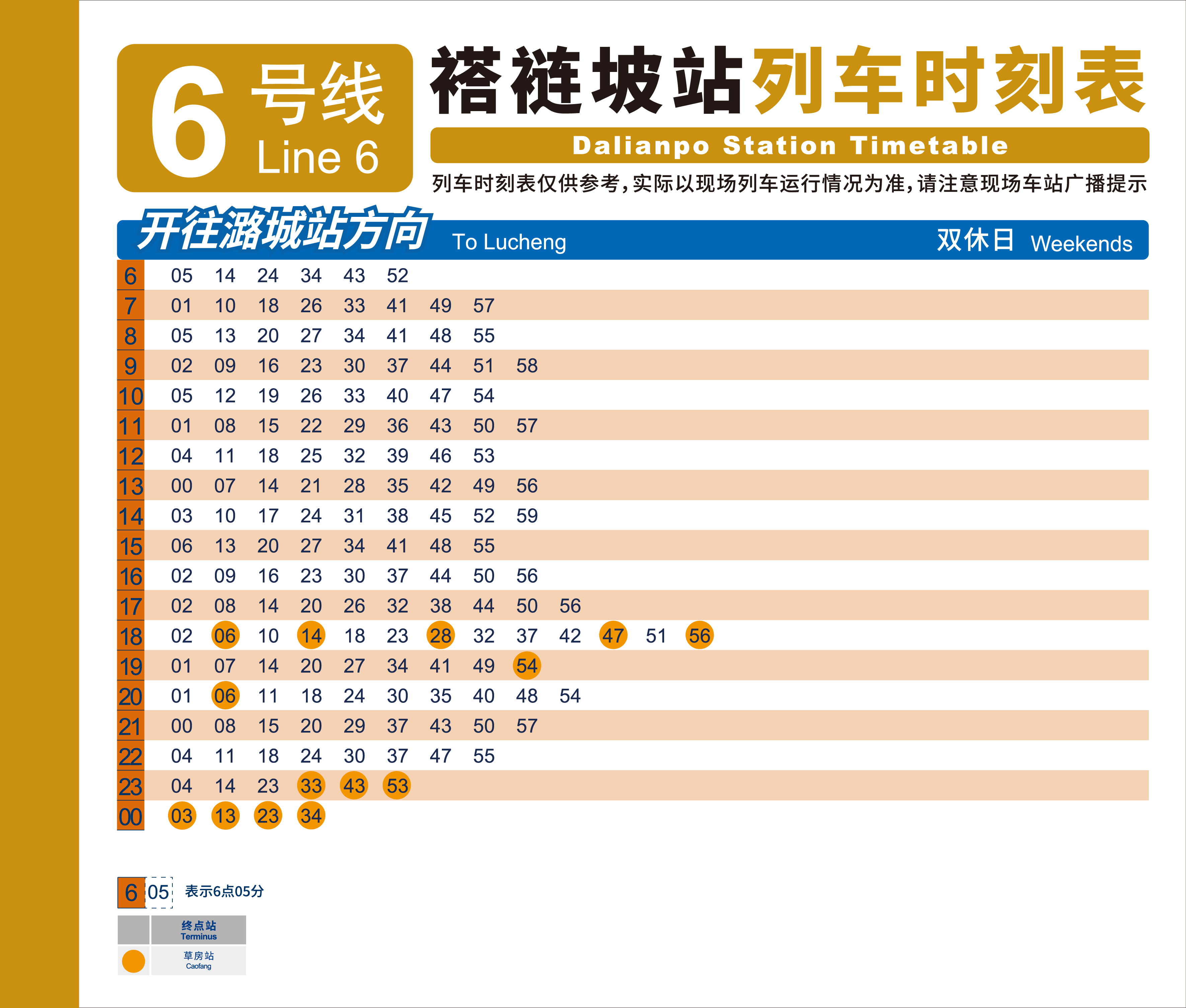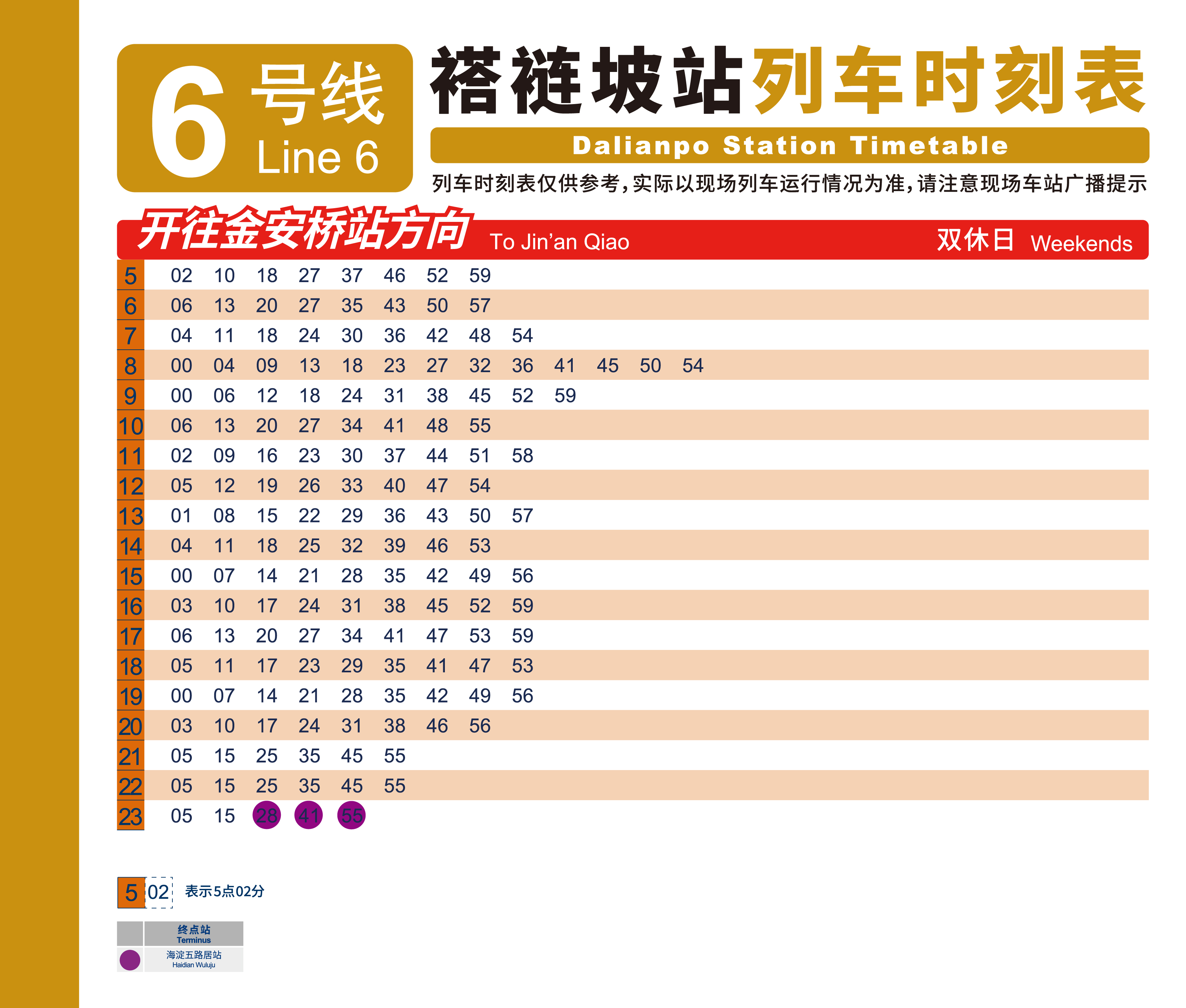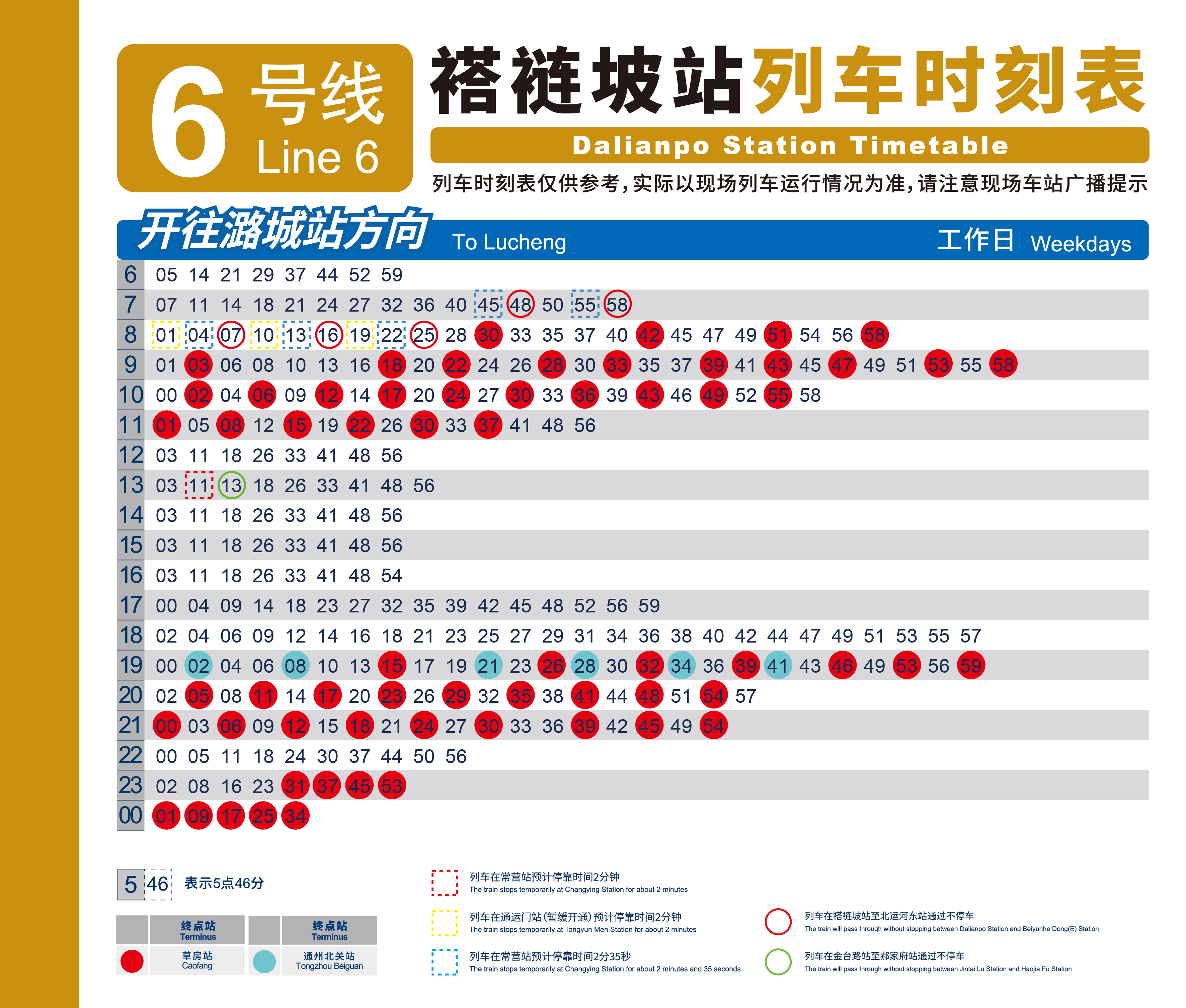 6号线 金安桥—潞城首车 6:05末车 23:23末车(草房) 0:346号线 潞城—金安桥首车 5:02末车 23:15末车(海淀五路居) 23:55