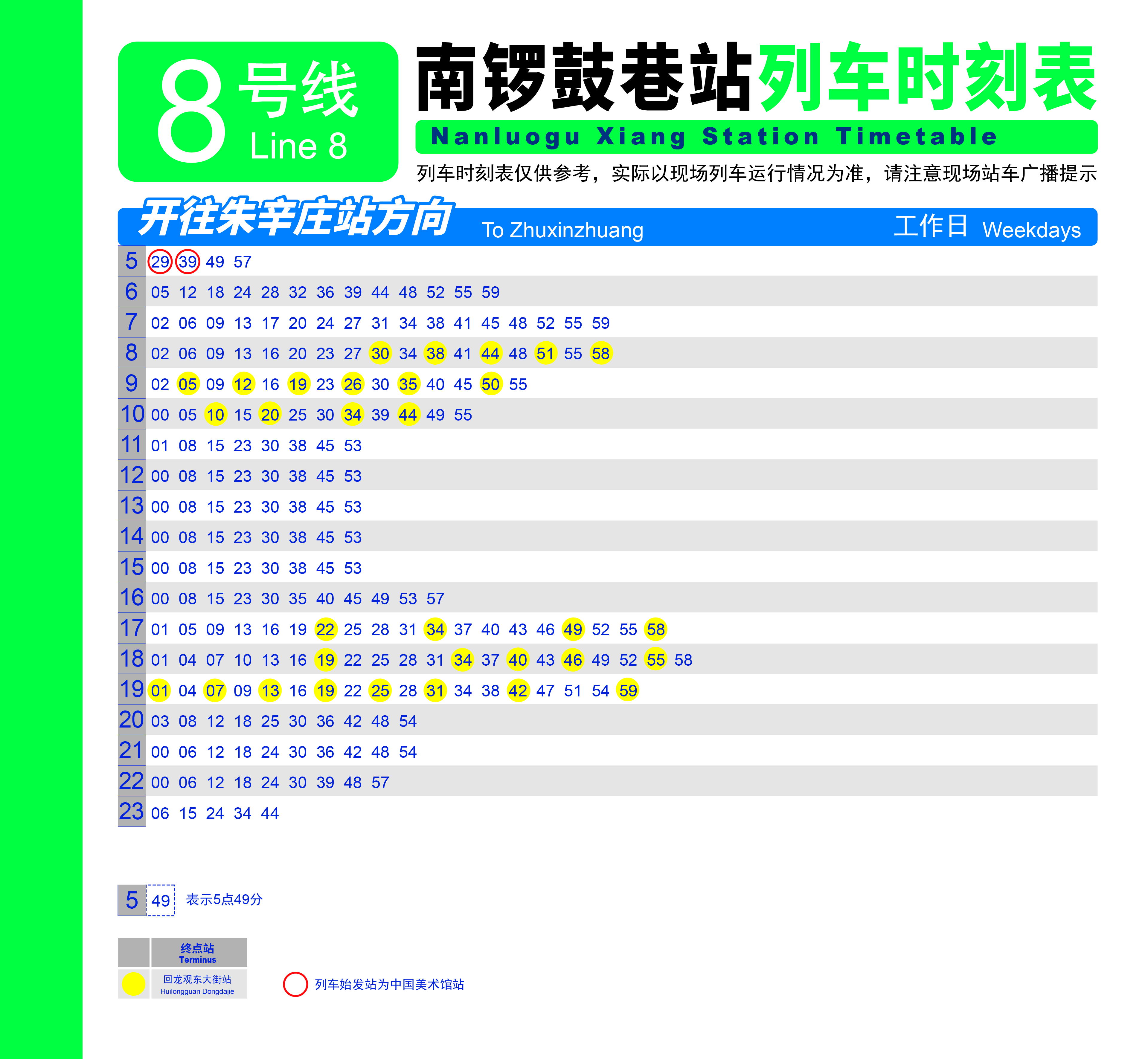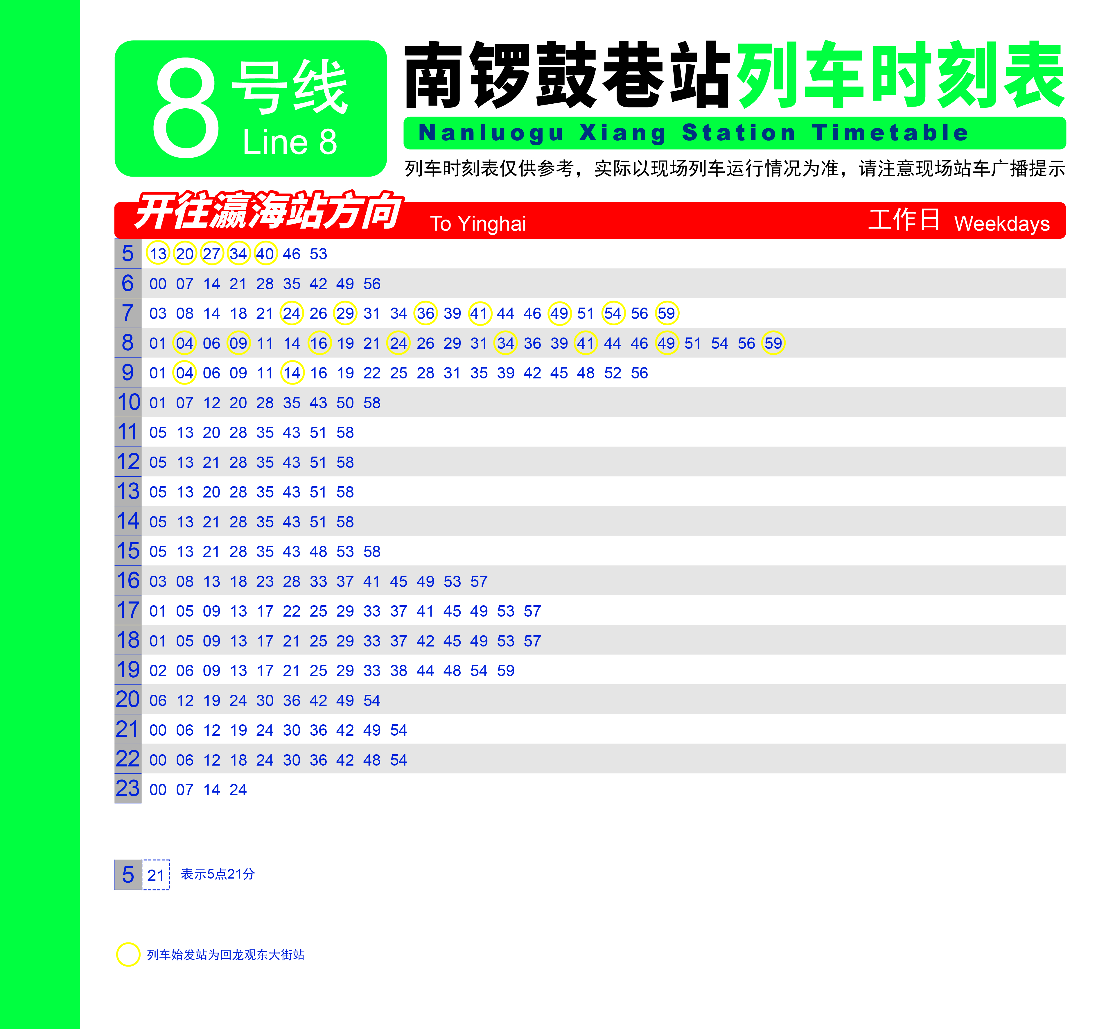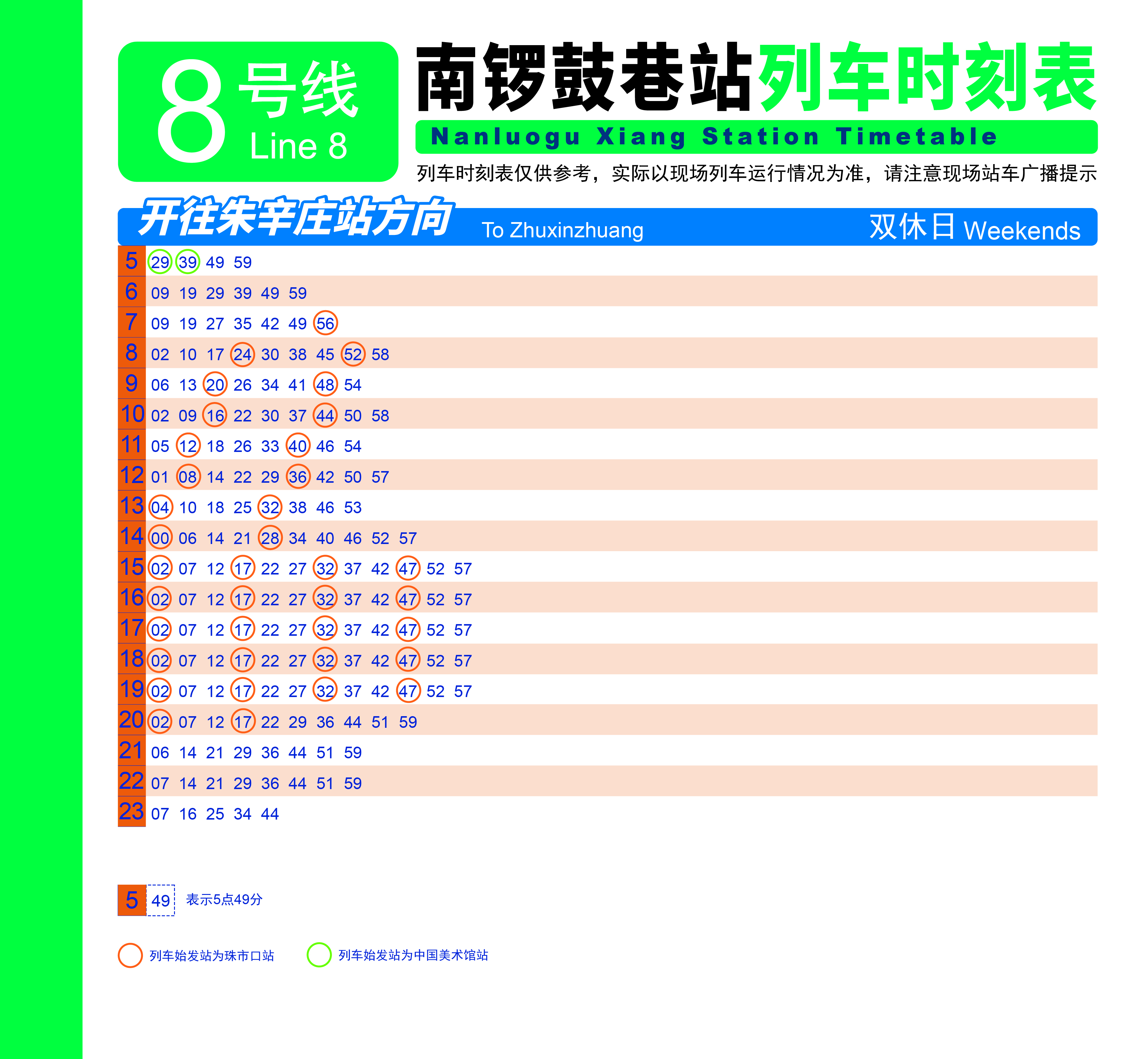 8号线 朱辛庄—瀛海首车 5:13末车 23:248号线 瀛海—朱辛庄首车 5:29末车 23:44