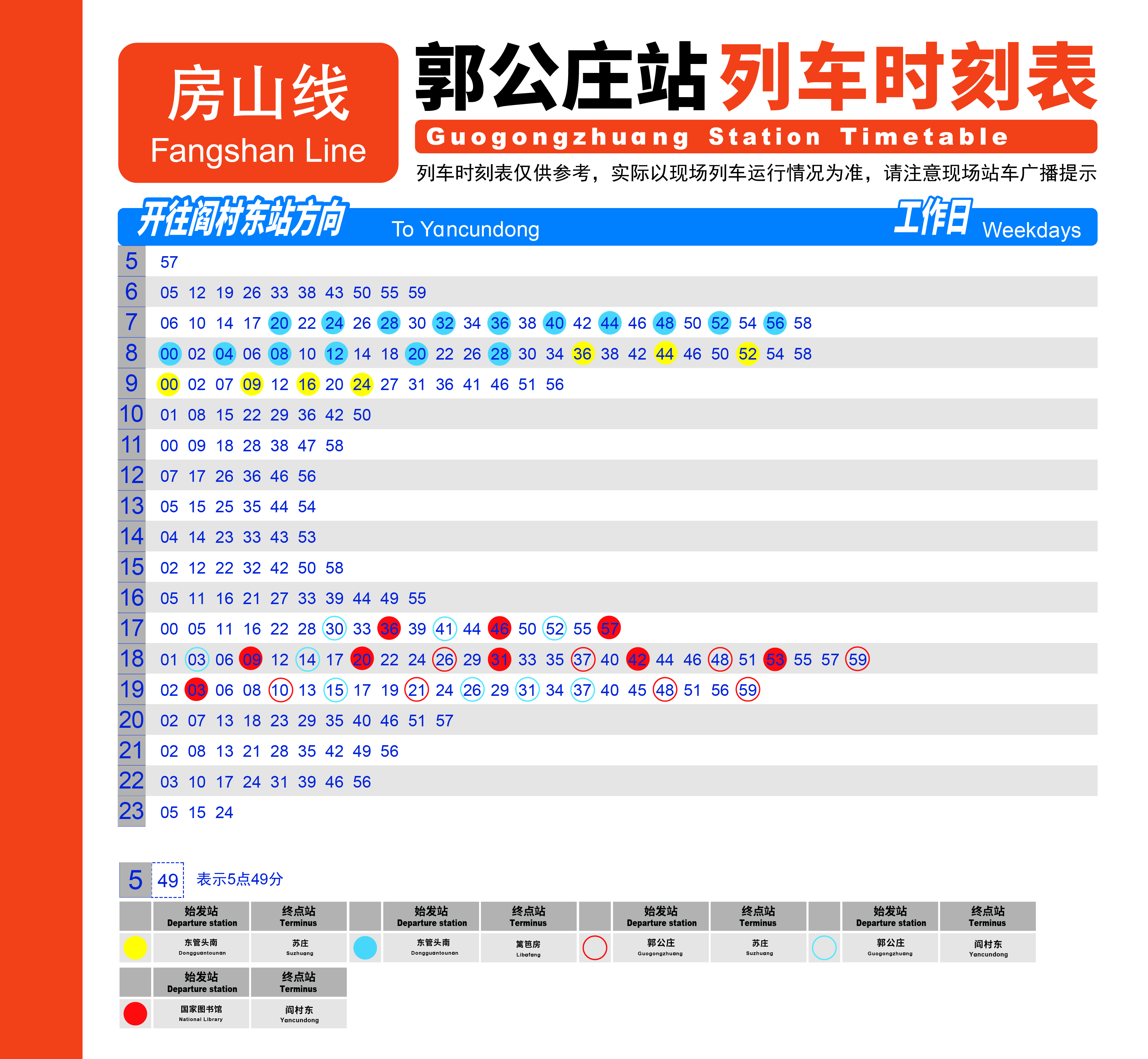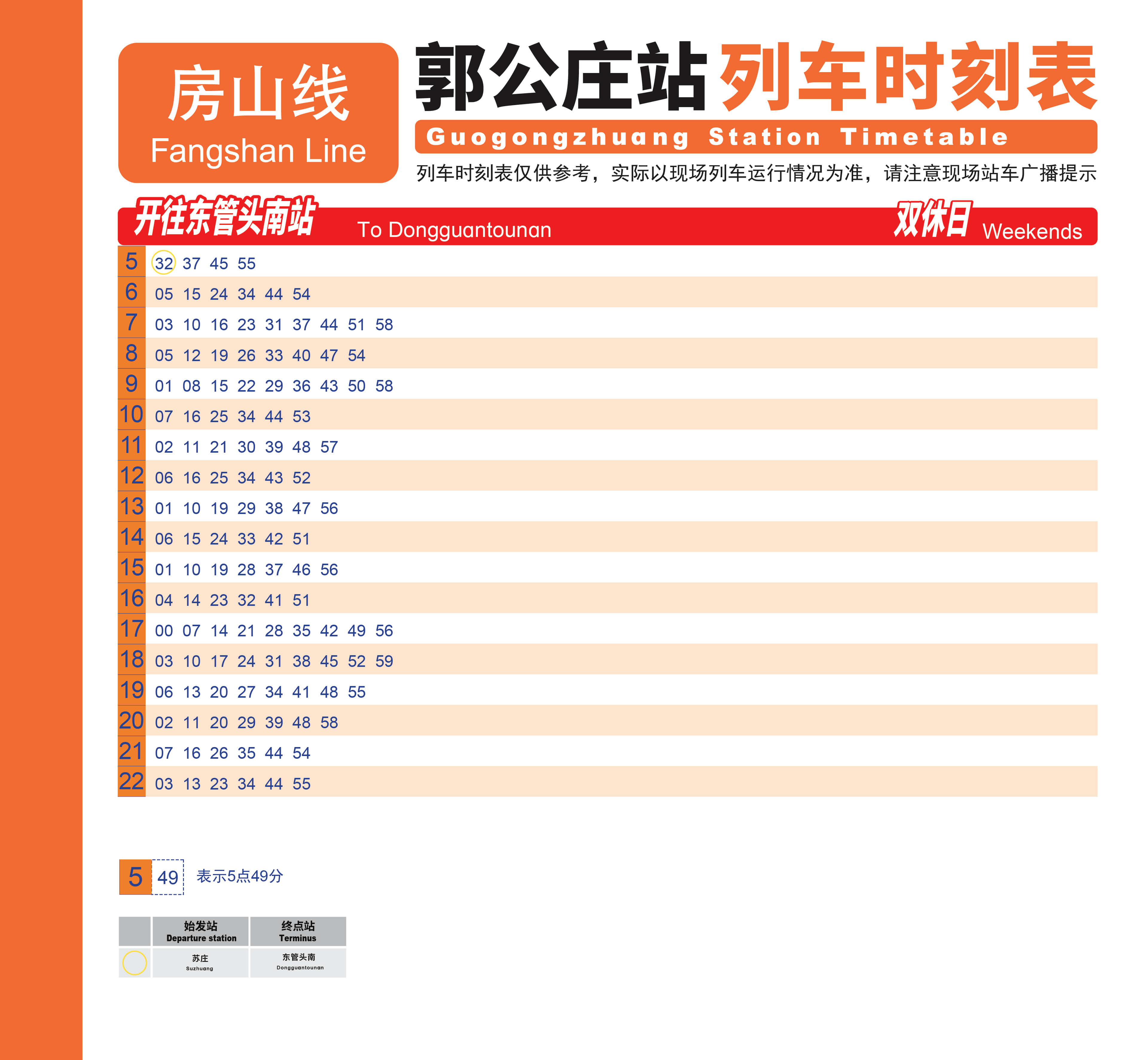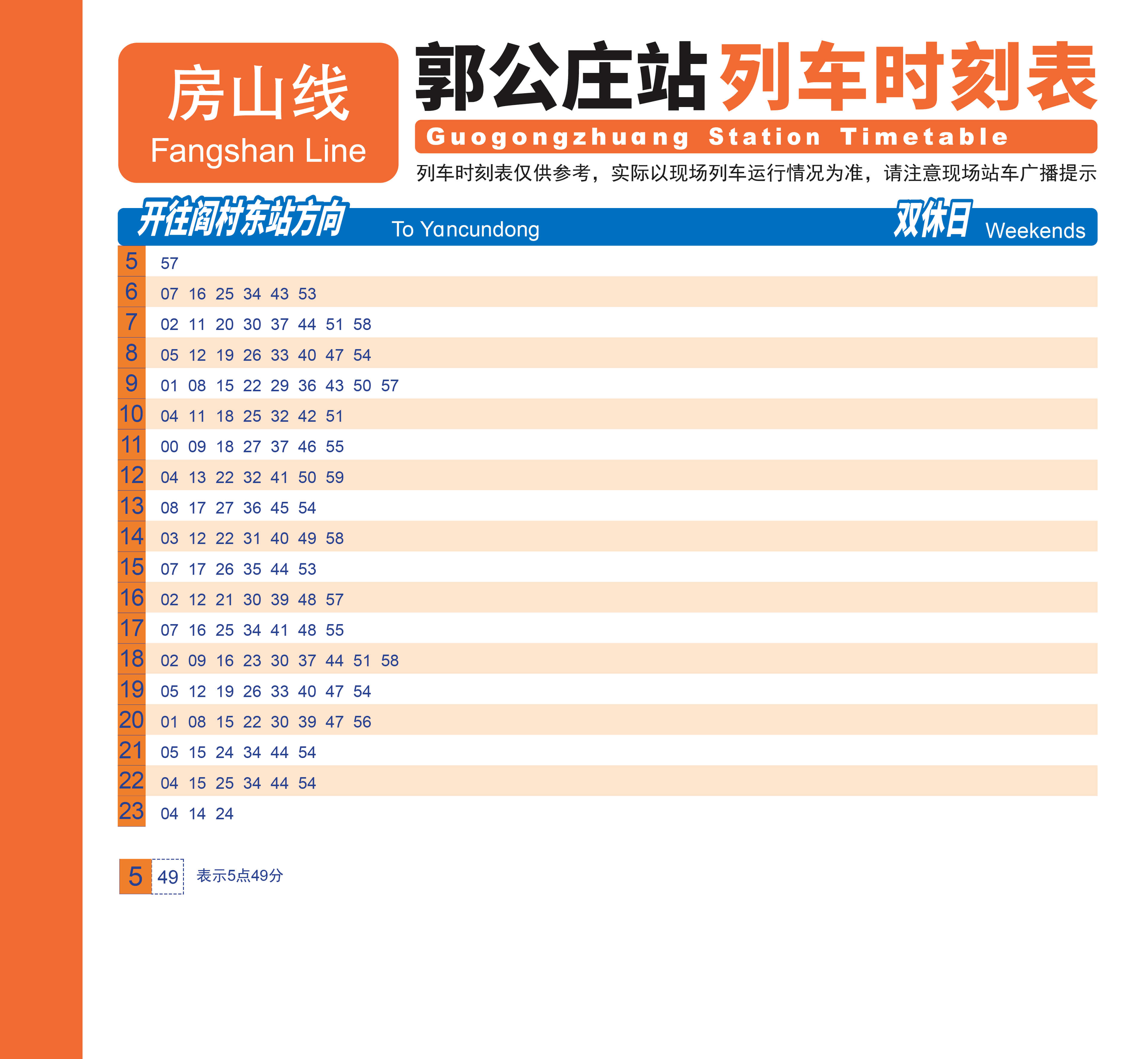房山线 阎村东—东管头南首车 5:32末车 22:55房山线 东管头南—阎村东首车 5:57末车 23:24
