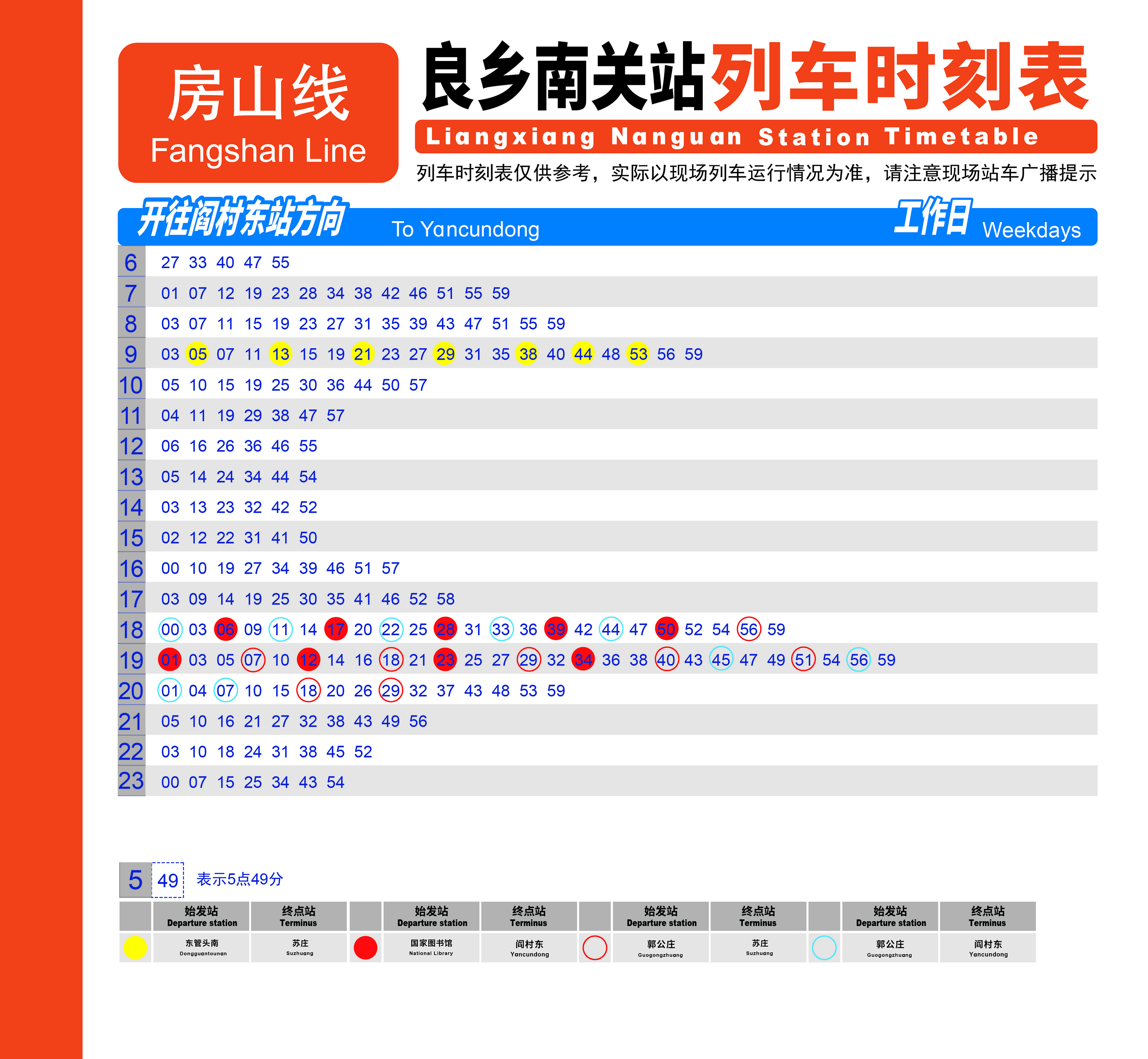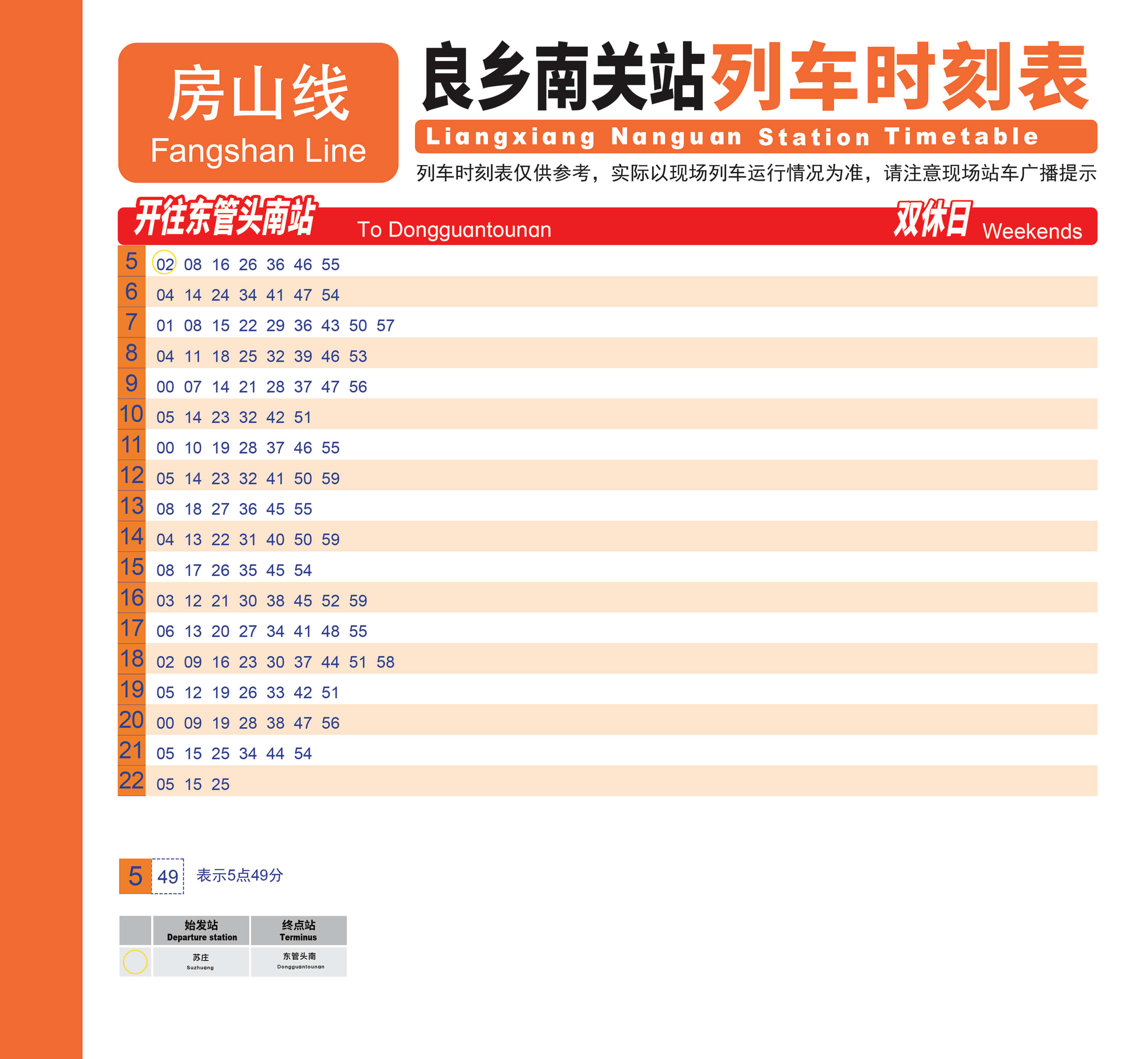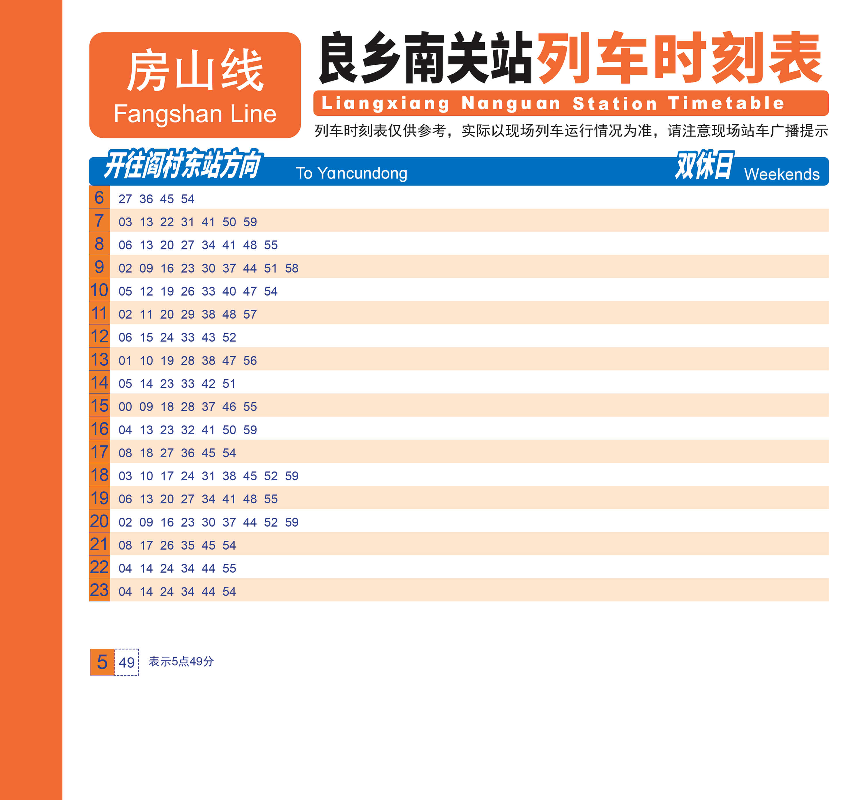 房山线 阎村东—东管头南首车 5:02末车 22:25房山线 东管头南—阎村东首车 6:27末车 23:54