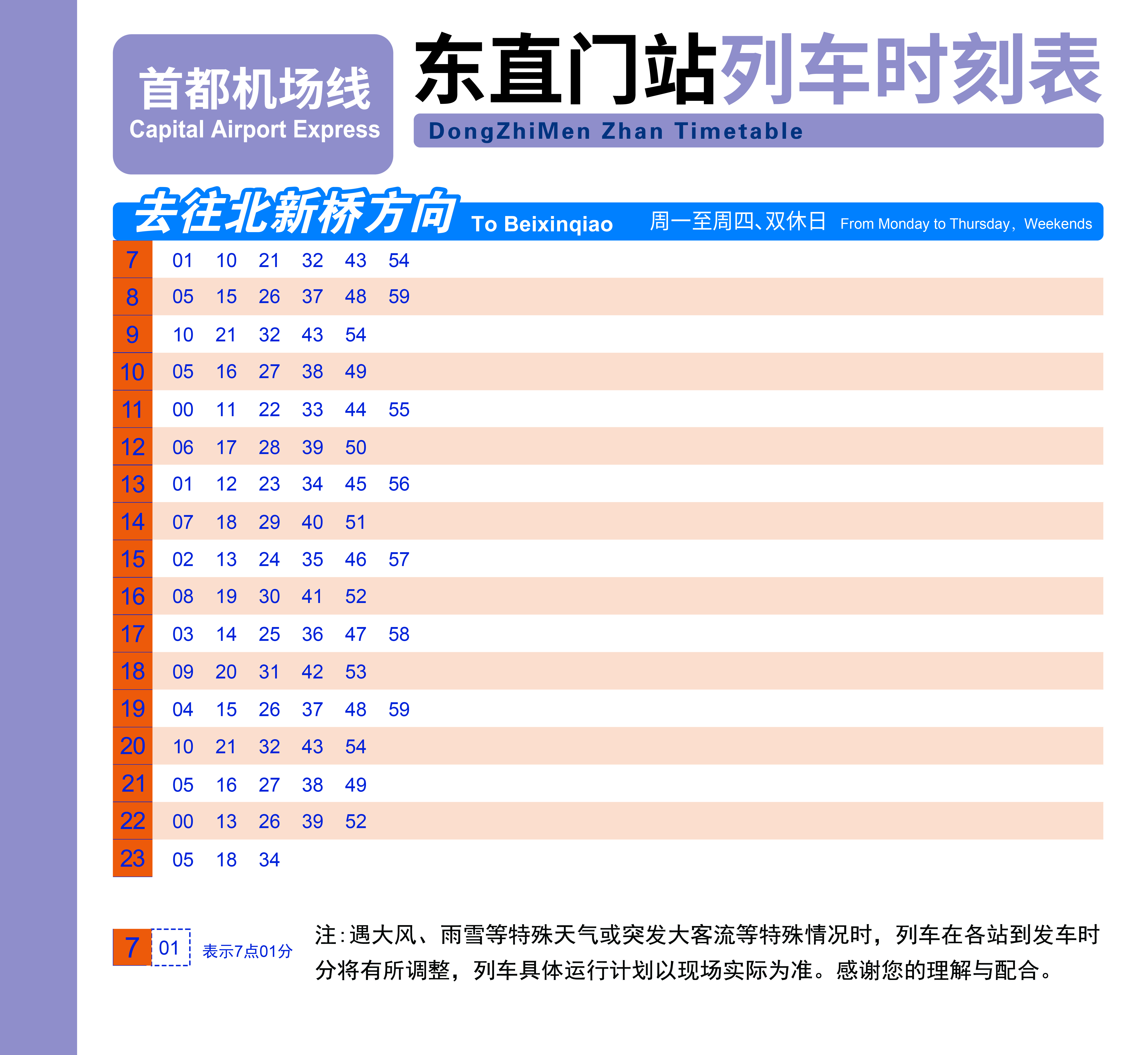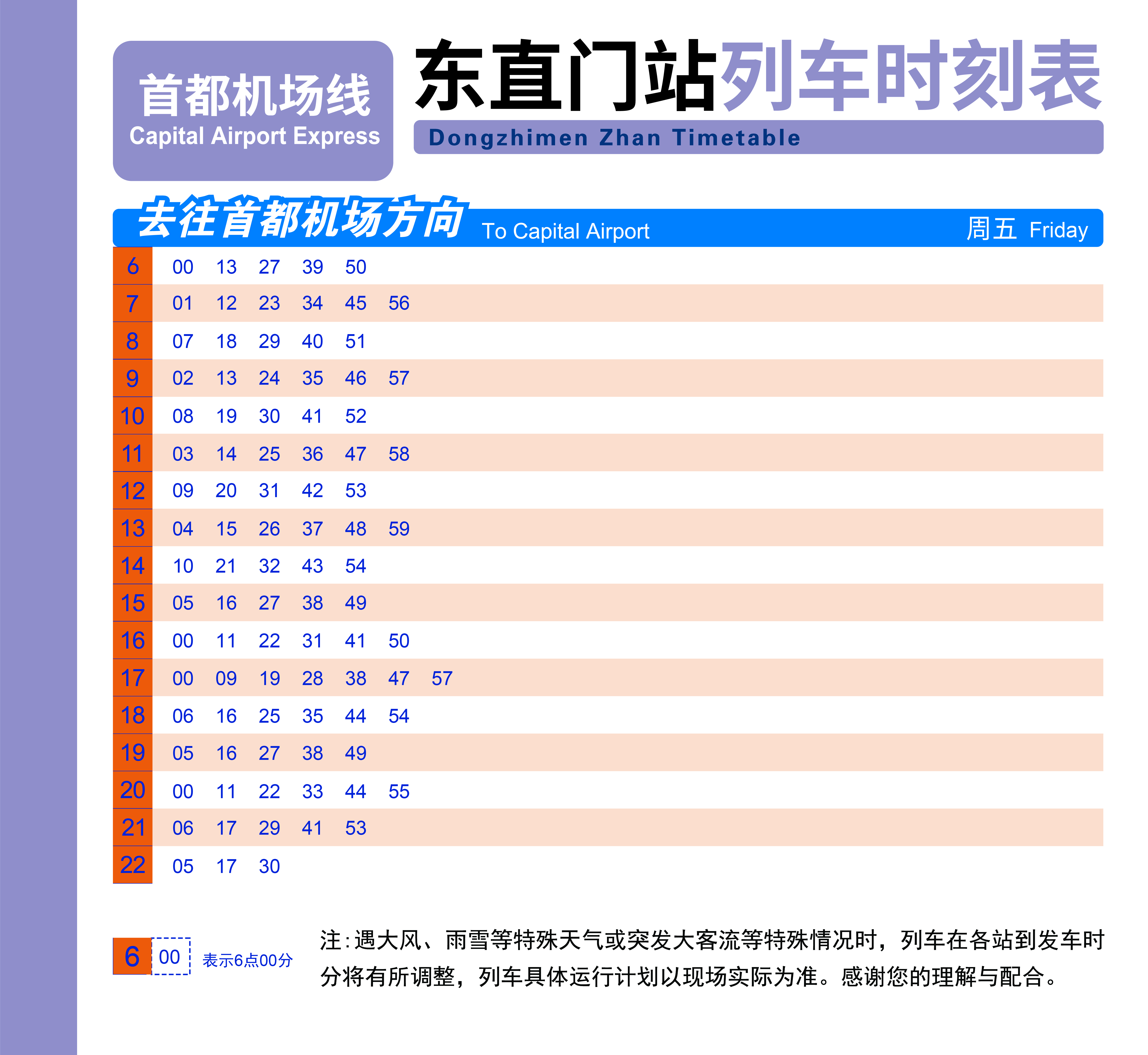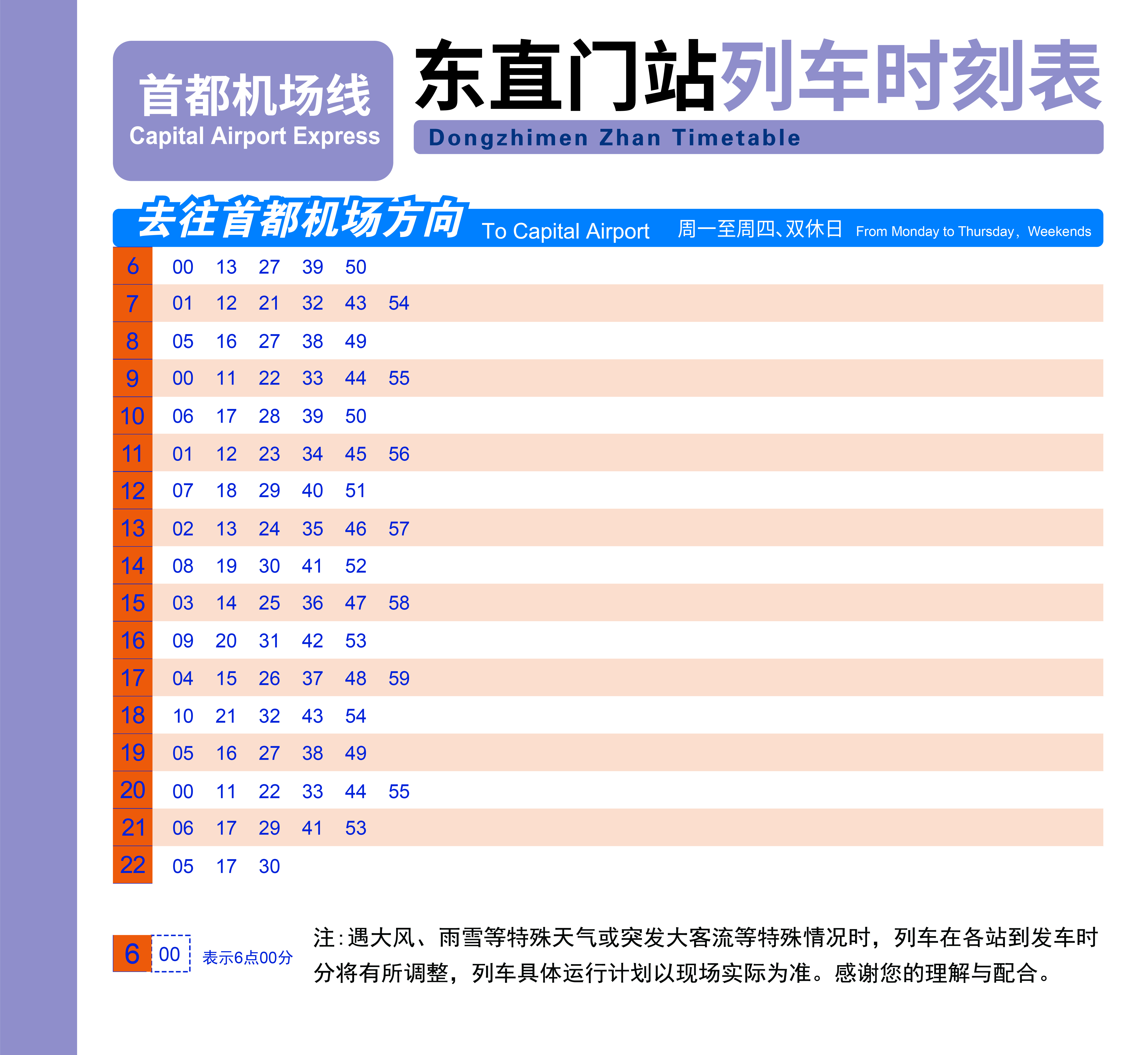 首都机场线 上行—市区首车 7:01末车 23:34首都机场线 下行—机场首车 6:00末车 22:30