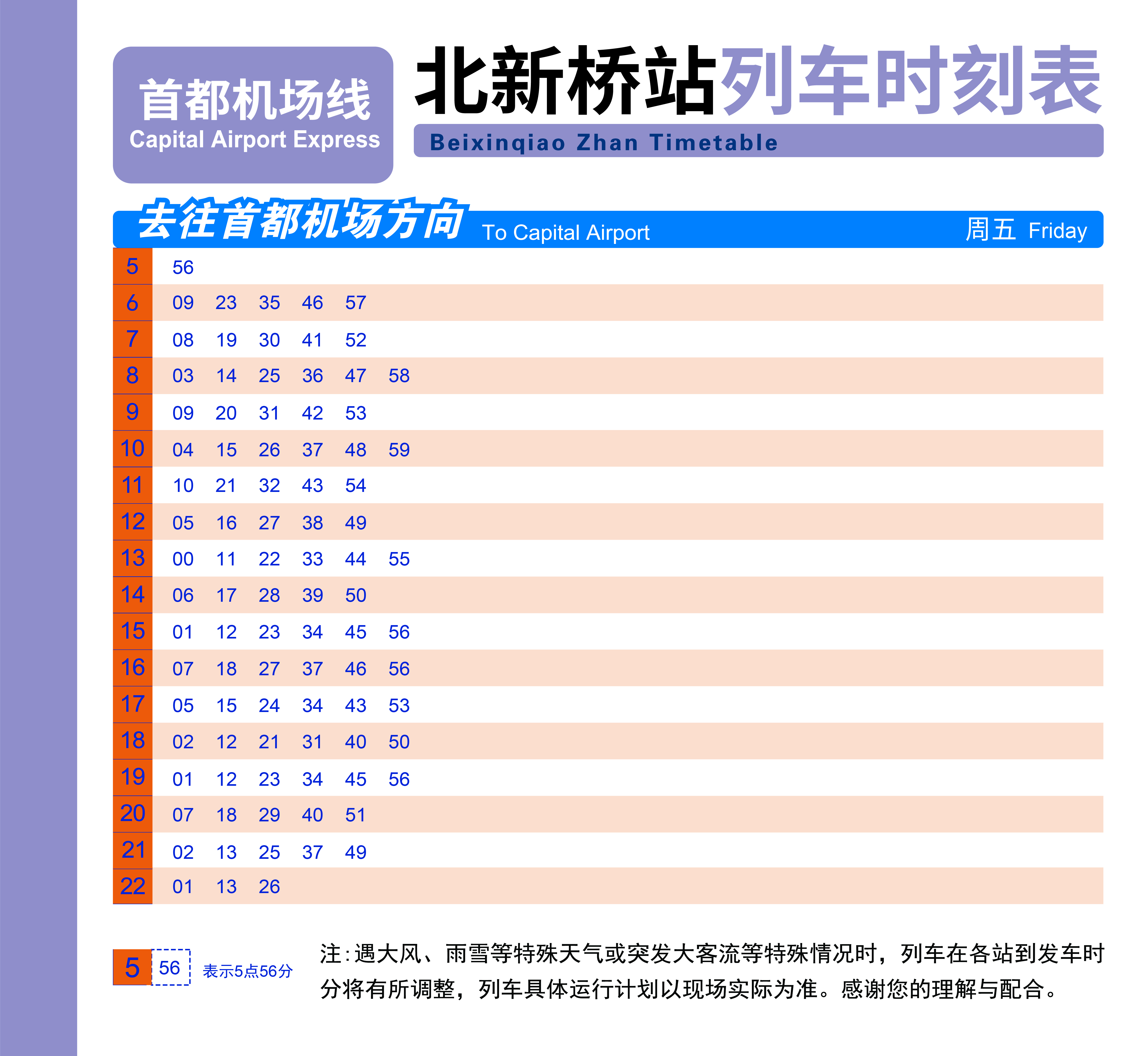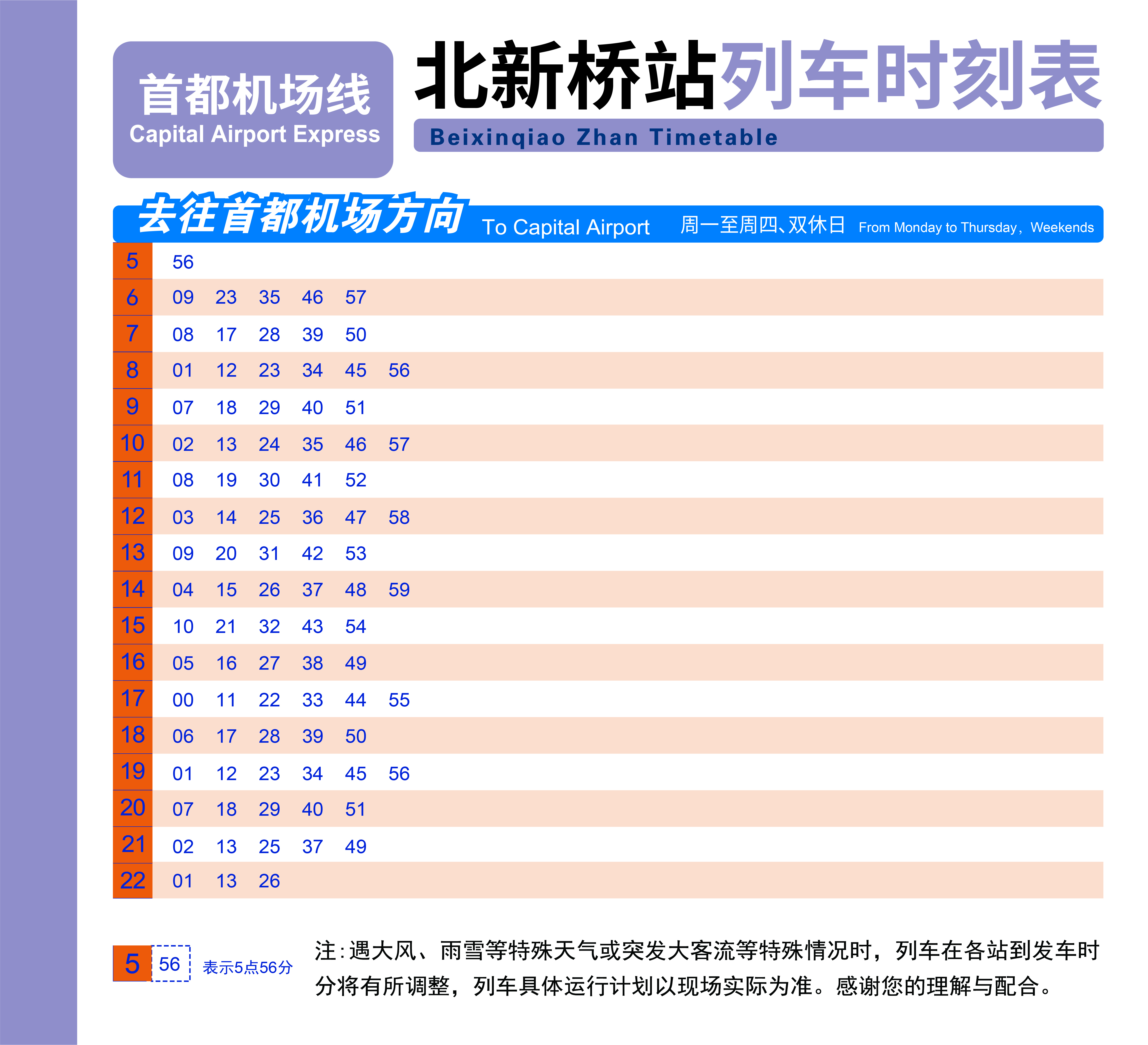 首都机场线 上行—市区首车 ——末车 ——首都机场线 下行—机场首车 5:56末车 22:26