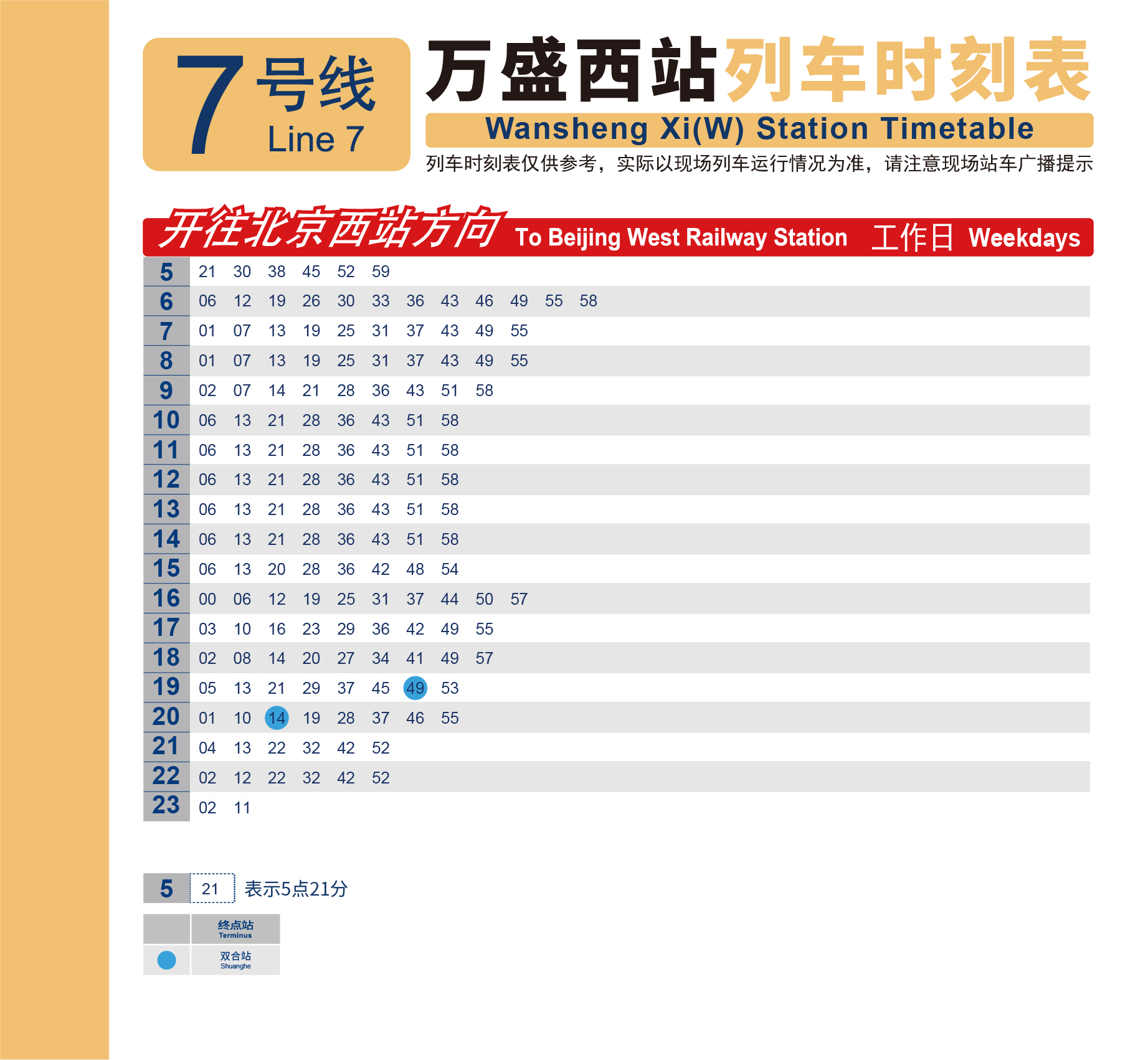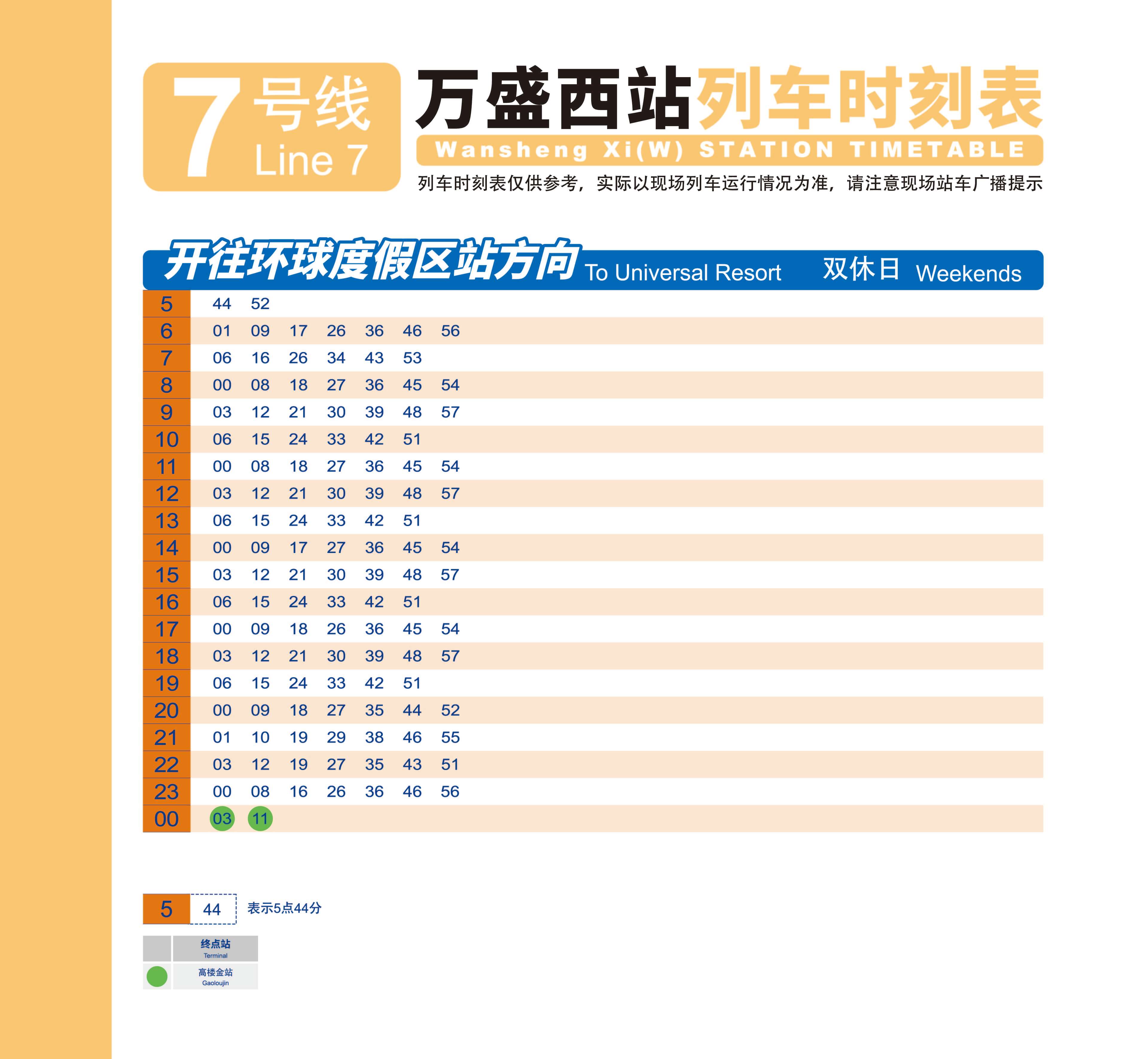 7号线 北京西站—环球度假区首车 5:44末车 23:56末车终点高楼金 0:117号线 环球度假区—北京西站首车 5:21末车 23:11